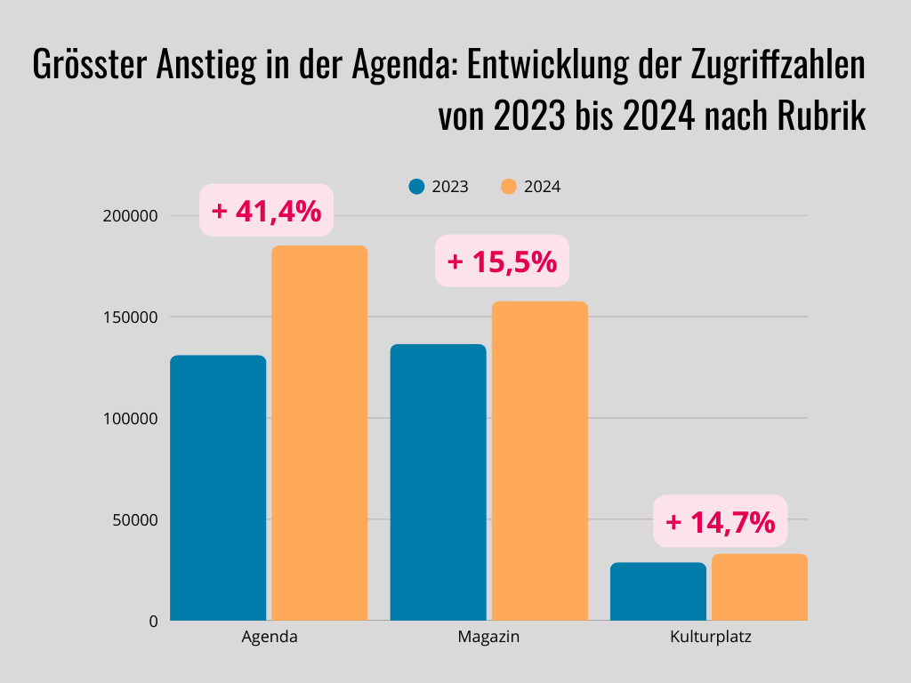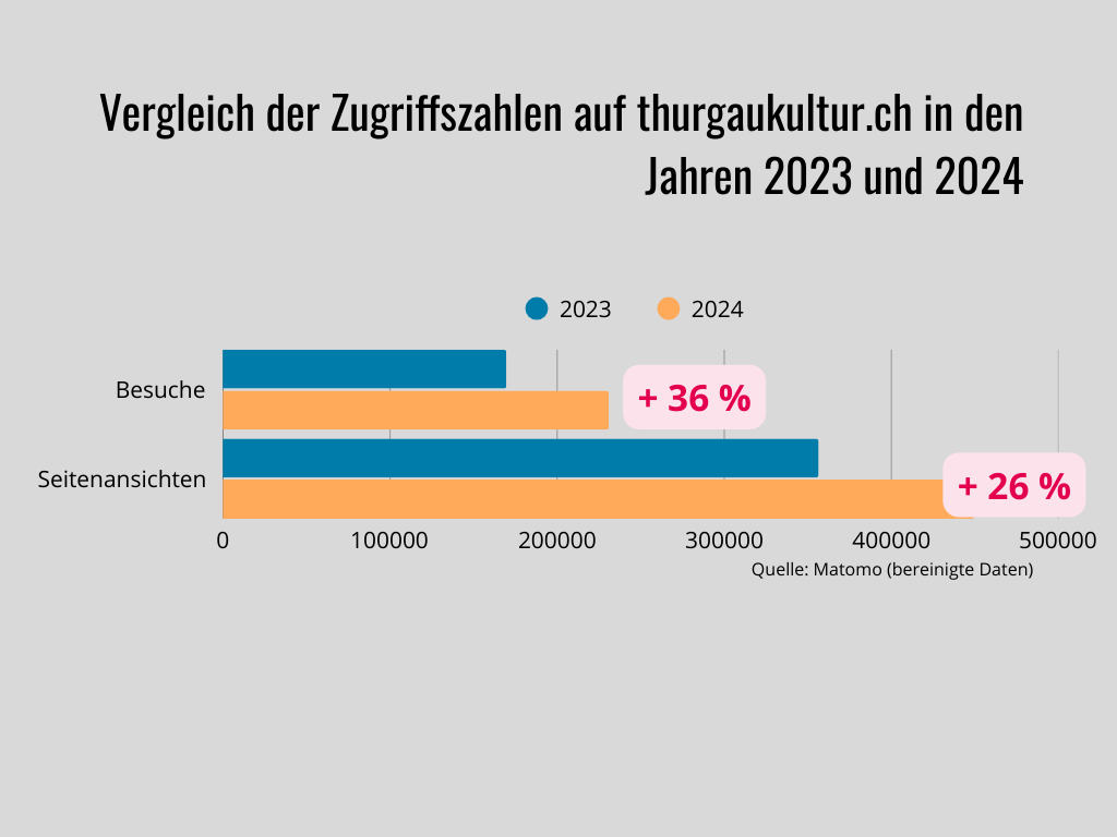 Mehr Leser:innen, mehr Nutzer:innen und ein neuer Rekord: 2024 war für thurgaukultur.ch ein ziemlich gutes Jahr. In unserem Jubiläumsjahr (2024 feierten wir 15. Geburtstag) wurde unsere Internetseite so oft besucht wie noch nie zuvor. Fast 450’000 Seitenansichten gab es 2024, erstmals landen wir damit über der Zahl von 400’000. Im Vergleich zum Vorjahr ist das eine Steigerungsrate von mehr als 25 Prozent.
