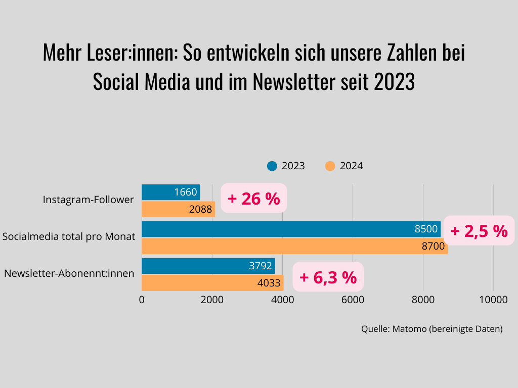 Auch in anderen Bereichen steigen unsere Zahlen: Die Verweildauer auf unserem Kulturportal wird länger (durchschnittlich lag sie 2024 bei 3 Minuten und 3 Sekunden), die Zahl der Abonnent:innen unserer Newsletter nimmt zu und die Follower:innenzahl auf Social Media (insbesondere bei Instagram) steigt deutlich. Letzteres sicher auch ein Ergebnis davon, dass wir unseren Auftritt dort seit Frühjahr 2023 professionalisiert haben.