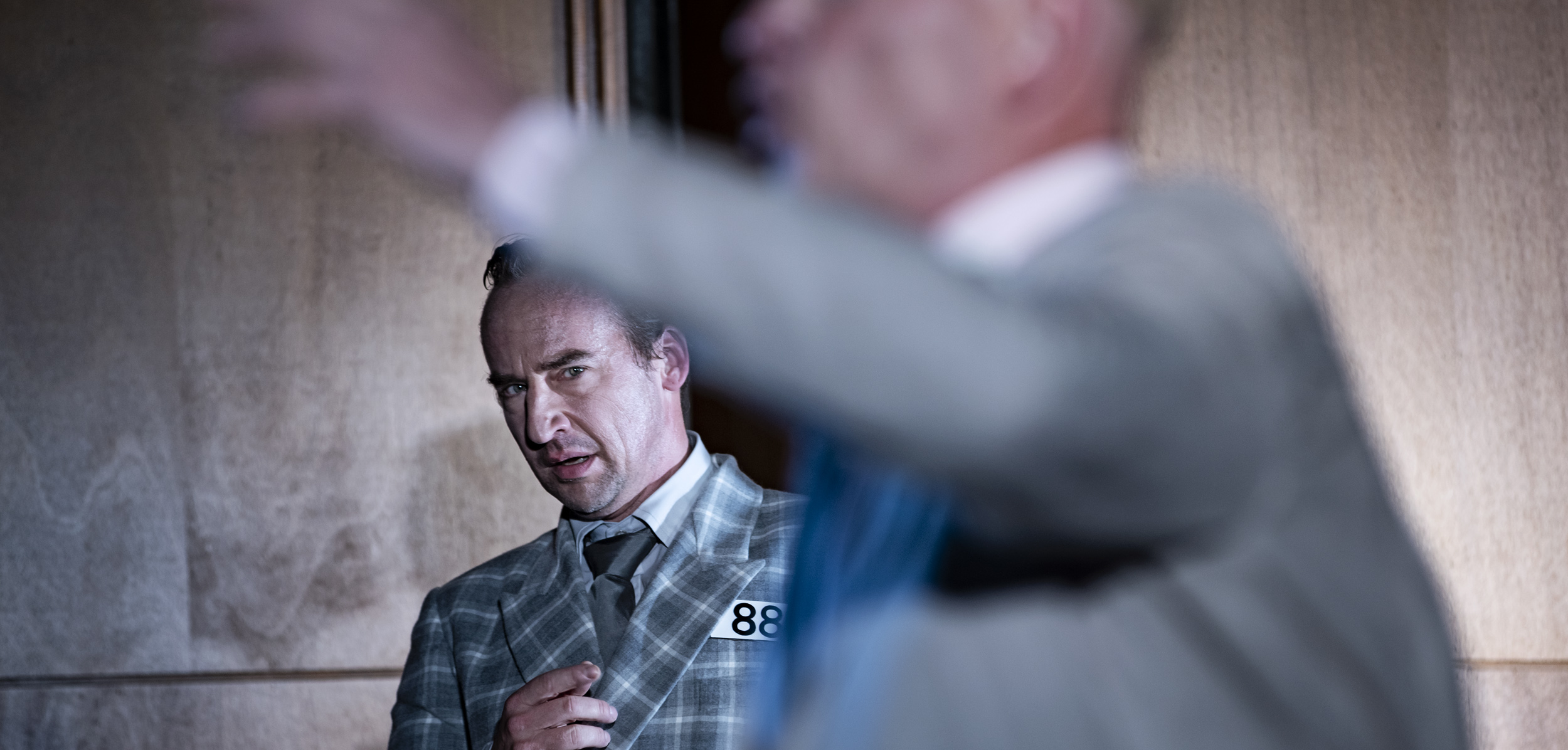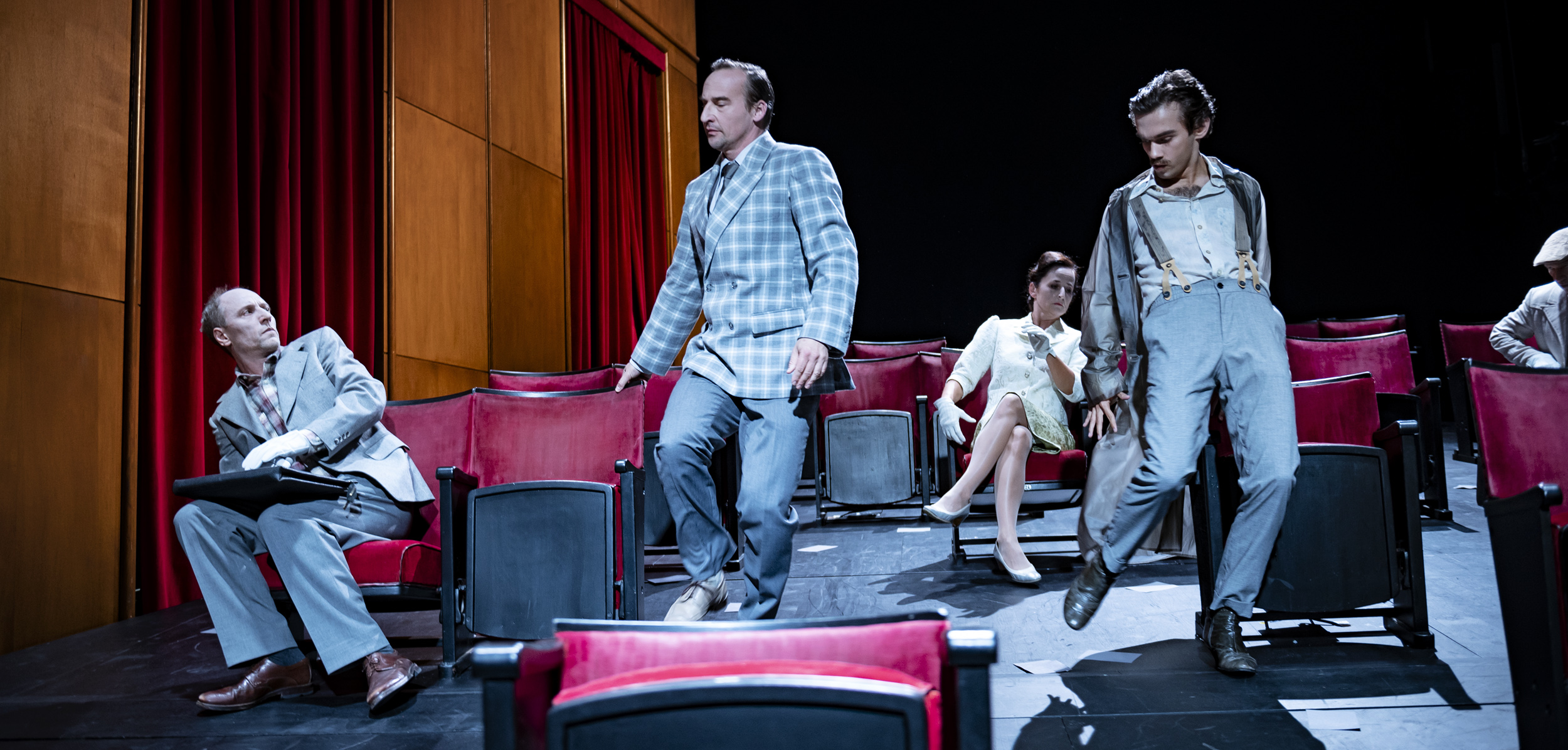 Zurück zur Auftakt-Premiere „Jeder stirbt für sich allein“. „Alle machen, was alle machen“, ist vielleicht der gewichtigste Satz des Abends, gesprochen von Anna Quangel, deren Sohn „für Führer, Volk und Vaterland gefallen“ ist. Dass es dabei auch um uns geht, um das Publikum, das wegen Corona im Theater auf einmal statt in der Economy- in der Business-Class zu sitzen kommt (drei Viertel der Sitze wurde abmontiert), wird mit dem ersten Bild klargestellt: Die Bühne ist ausgestaltet wie der Zuschauerraum, sie spiegelt ihn bis hin zur hölzernen Wandverkleidung und den schweren roten Vorhängen, die Fenster zum Verschwinden bringen und das Innen vom Außen effektiv trennen. Der Innenraum ist nun in der Anschauung eins, als wäre ein Entrinnen weder vom Dargestellten noch von der Realität möglich. Auch wenn diese Vorgabe ein zu deutliches Signal setzt, geht davon doch eine gewisse Irritation aus (Bühne: Carolin Mittler).
