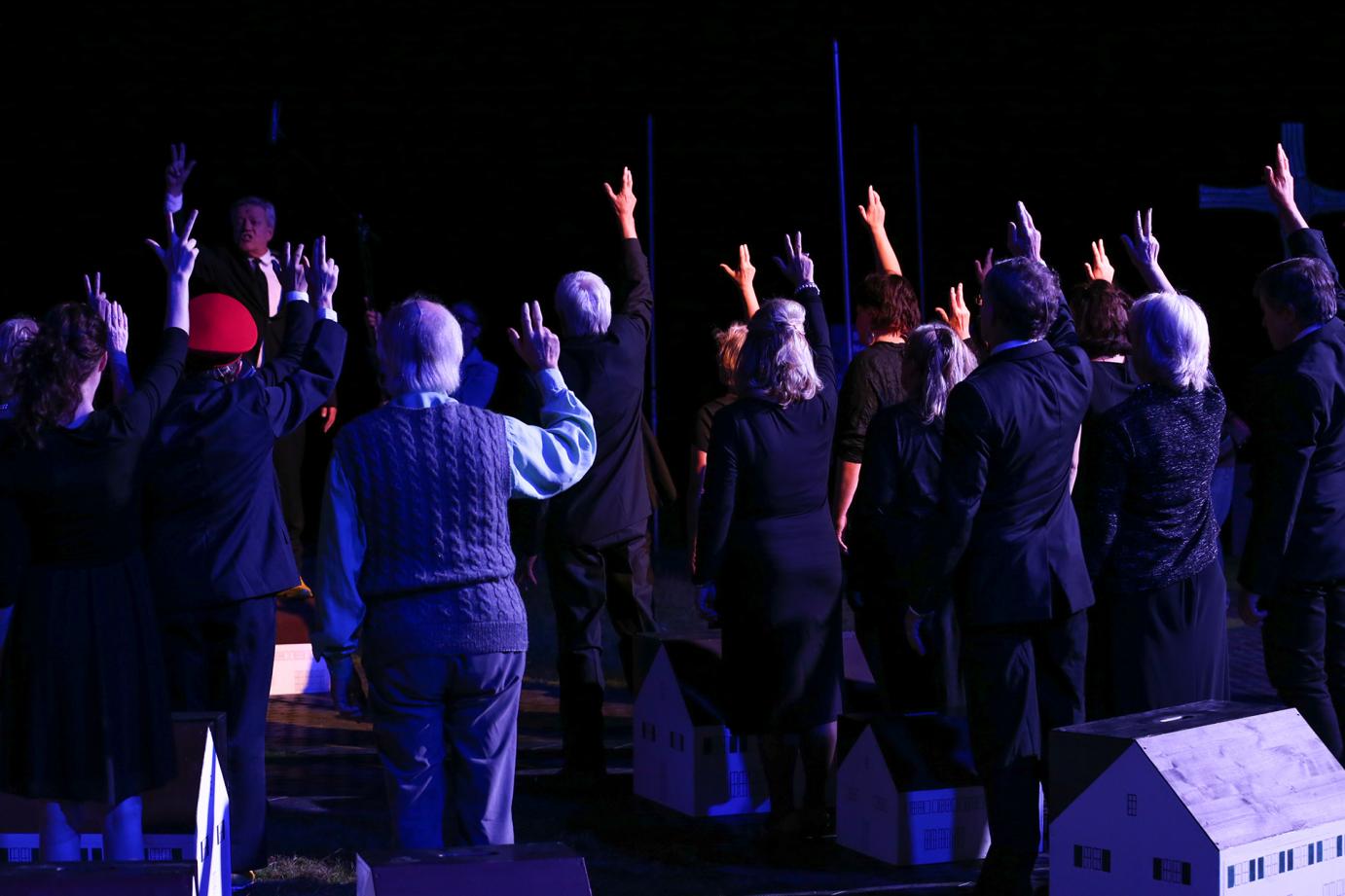 Monika Wild inszeniert die 1954 uraufgeführte Tragikomödie mit rund 50 Laiendarstellern nahe an der Vorlage von Dürrenmatt. Nach „Idda von Toggenburg“ und „D’Geierwally“ ist es bereits ihre dritte Arbeit für die Bühne Ostschweiz, der ehemaligen Freilichtbühne Thurtal. Die erfahrene Regisseurin nutzt für die alte Dame den grossen Umschwung vor der Villa. Das ist eine Stärke des Stücks, weil verschiedene Stationen parallel bespielbar sind. Gleichzeitig eine Schwäche: Nur, wer auf der überdachten Tribüne mit ihren 800 Plätzen in der Mitte sitzt, hat den Überblick.