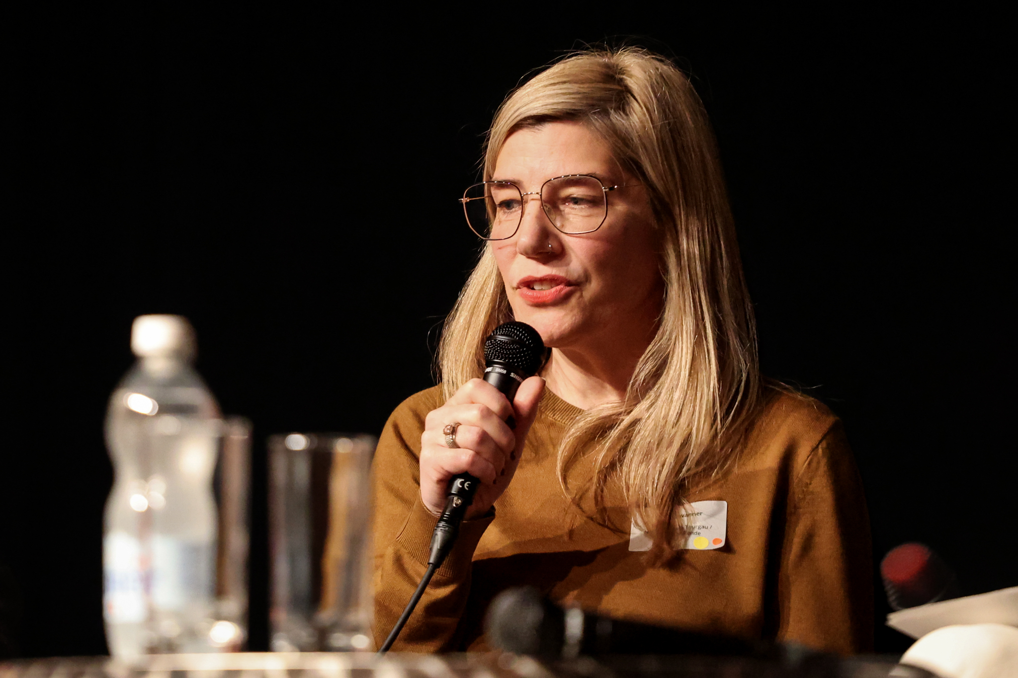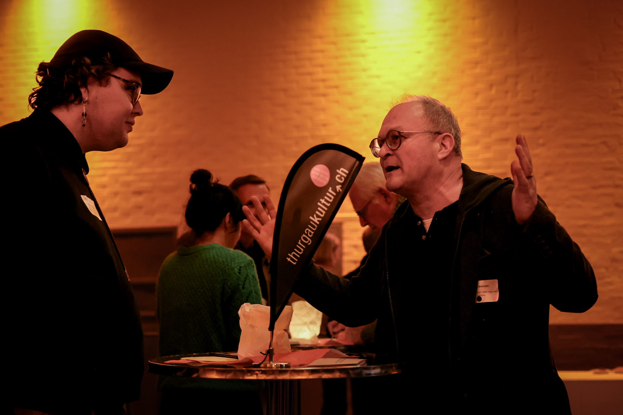 Nach diesem Überblick auf die verschiedenen Positionen treffen sich je eine Vertreterin beziehungsweise ein Vertreter aus Politik und Kultur am Stehtisch zum Speed-Dating. Hier entstehen nicht nur Begegnungen, sondern auch neue Einsichten. Tabea Steiner und GLP-Kantonsrätin Nicole Zeitner sprechen über den Thurgau-Bezug, den es braucht, um als Kulturschaffende:r vom Thurgauer Lotteriefonds zu profitieren. Sie tauschen sich auch darüber aus, welche Bereiche in ihrem Beruf sichtbar sind und wie hoch der Anteil an unsichtbarer Arbeit ist.