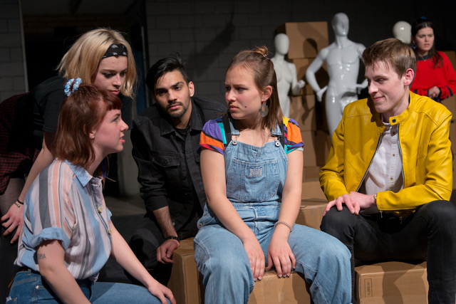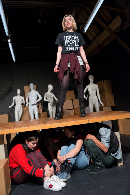 Aus ihnen soll etwas werden, sie sollen etwas darstellen. Wenn sie alle zusammen auf dem Fliessband sitzen (Bühne von Gabor Nemeth), das später auch dazu dient, ihre wichtigsten Dinge auf einen Berg von Bedeutung zu befördern, dann ist klar: Das sind junge Menschen, die die Norm erfüllen sollen, reinpassen sollen, gerne in gehobener Stellung. Und das wissen sie. Die Schülerinnen und Schüler treffen sich nicht in einem verlassenen Sägewerk wie bei der dänischen Autorin, deren Roman bei Erscheinen so umstritten war, wie er dann ausgezeichnet wurde, sondern in einer Schaufensterpuppenfabrik.