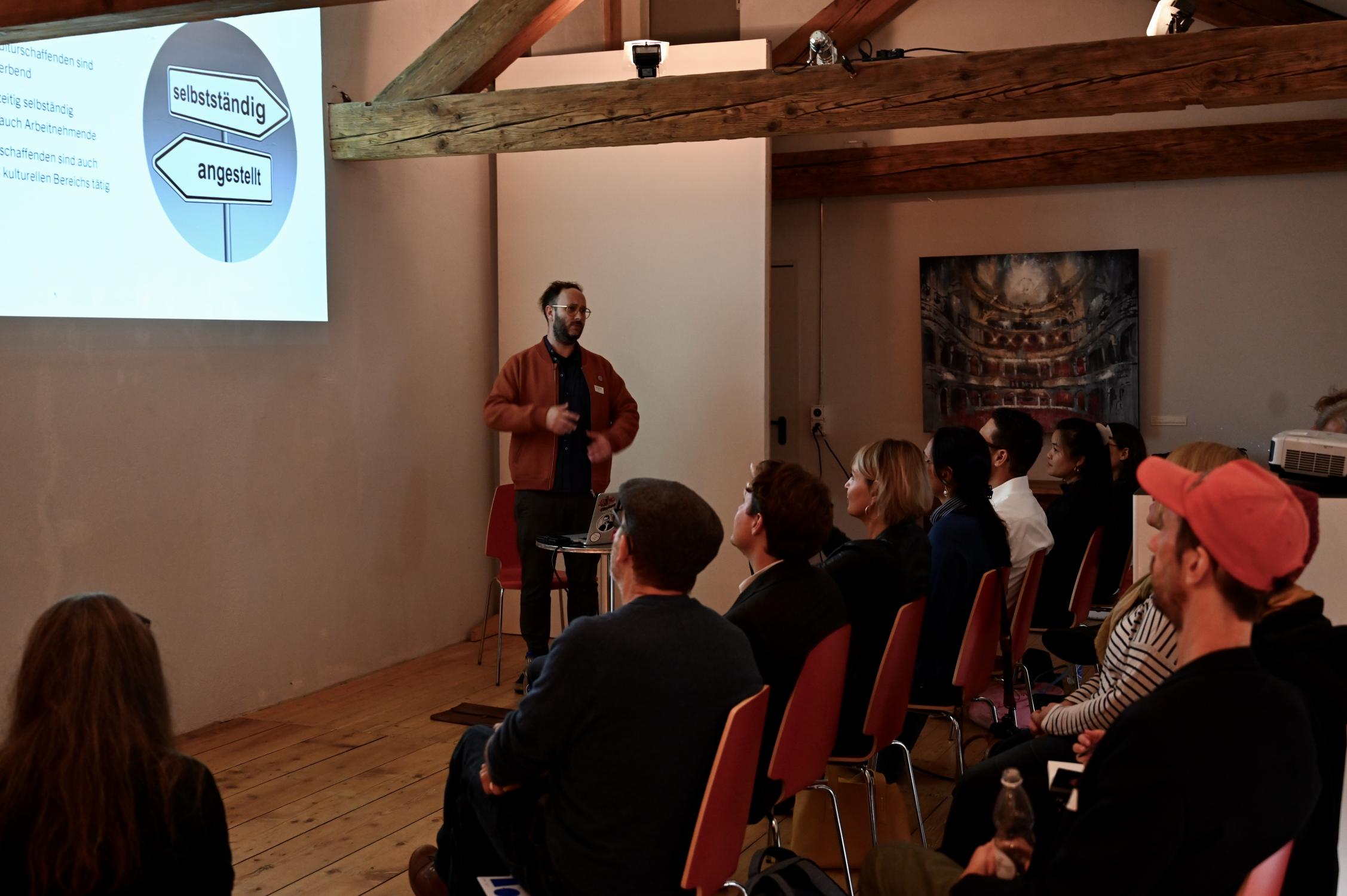In einem Impulsreferat präsentierte Benedikt Wieland einige unangenehme Zahlen, so seien über 50 Prozent der Kulturschaffenden in der Schweiz selbstständig erwerbend, wobei hingegen nur 70 Prozent dieser Selbstständigen AHV Beiträge errichten (Stichwort Beitragslücken). Besonders prekär ist dabei auch, dass über 50 Prozent der selbstständig erwerbenden Kulturschaffenden über keine Krankentaggeldversicherung verfügen.