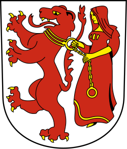 Die Deutung des Wappens… war stets umstritten und ist bis heute nicht restlos geklärt. Die Farben Rot auf Weiss bestimmen auch das Wappen des Grundherrn, des Klosters Reichenau. Der Löwe steht nach Ansicht der Forschung für die Habsburger, die zur Zeit des erstmaligen Auftauchens des Stadtwappens im Siegel als Nachfolger der Kyburger die reichenauische Vogtei über die Stadt ausübten. Kopfzerbrechen hat die weibliche Figur – eine anmutige Bürgersfrau ohne Nimbus (Heiligenschein) – bereitet. Doch ist der hochmittelalterlichen Bildsprache eine weltlich gekleidete, «bürgerliche» Gottesmutter nicht fremd, zeigt doch die Bibel selbst Maria als verheiratete Frau und Mutter. Kurz: Auch das «Fräuli» im Wappen dürfte die Herkunft des Stadtnamens spiegeln und an den einstigen Grundherrn, das Kloster Reichenau, erinnern. (Quelle: Webseite Stadt Frauenfeld)
