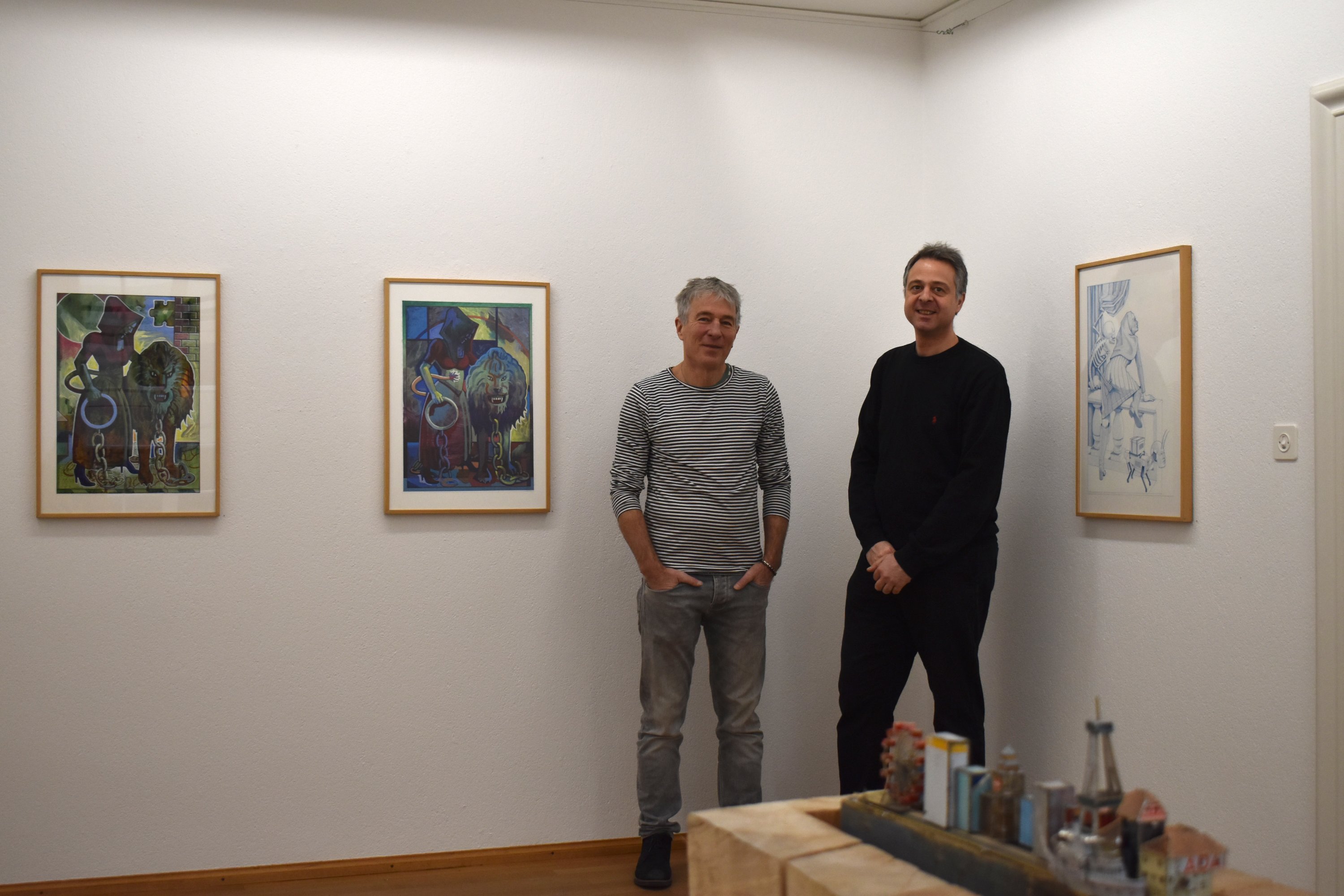Schnell hätten sich beide Künstler im Vorfeld der Ausstellung verständigt, obwohl sie sich zuvor gar nicht kannten, erzählen sie. Gemeinsamkeiten hätten sie rasch erkannt: gute Kommunikation, gute Laune und ein reibungsloser Aufbau. Neben der Detailverliebtheit und einem sichtbaren Hang zur Präzision sind es auch ähnliche Lebensthemen, die sie umtreiben – darunter Religion, Sexualität und das Leben im Allgemeinen.