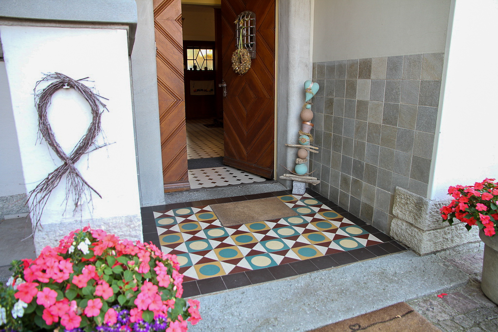 Die Farbauswahl im Haus mag kräftig erscheinen, doch dahinter steckt ein durchdachtes Konzept. „Früher war einiges farbiger, wie beispielsweise Tapeten,“ berichtet die Hausherrin. „Das wollten wir aufnehmen und haben gemeinsam mit einem Restaurator ein Farbkonzept aufgebaut.“ Die Strategie: Entweder lassen sich ursprüngliche Farben und Muster durch Abtrag der oberen Schichten rekonstruieren und wenn das nicht möglich ist, werfen Gloors einfach einen Blick vor die Tür. Vor dem Haupteingang liegen gut erhaltene, über 110 Jahre alte Bodenplatten, die das damalige Farbkonzept widerspiegeln.