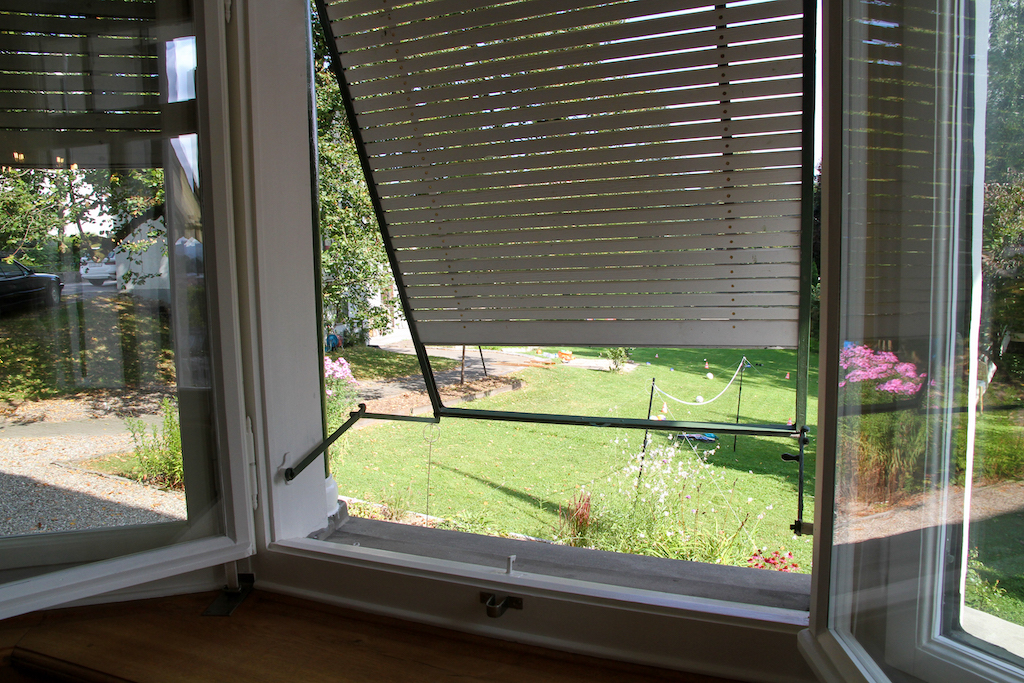 Lange Experimente und Versuche folgten, und der Hausherr musste einige Male umdenken. Mal hatte das gelieferte Holz zwar die richtige Sorte, aber zu viele Astlöcher. Oder es stellte sich heraus, dass sich Unterschiede in der Aufwicklung ergaben, je nachdem, ob die Storen in einem Aussen- oder einem Innenkasten aufgewickelt wurden. Doch dann konnte ein Prototyp im Erker montiert werden. „Es hat sich gelohnt,“ findet er. Der Prototyp funktioniert ausgezeichnet und steht dem Original in nichts nach.