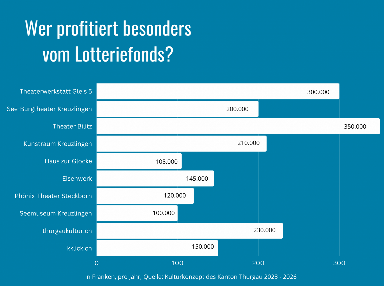 Blickt man also auf die einzelnen Institutionen, dann bekommen Theater Bilitz (350.000 Franken pro Jahr), Theaterwerkstatt Gleis 5 (300.000 Franken pro Jahr), thurgaukultur.ch (230.000 Franken pro Jahr), der Kunstraum Kreuzlingen (210.000 Franken pro Jahr) und das See-Burgtheater Kreuzlingen (200.000 Franken pro Jahr) die am höchsten dotierten Leistungsvereinbarungen. All das gäbe es ohne Lotteriefonds nicht. Das Thurgauer Kulturleben wäre ohne Lotteriefonds also ziemlich trist.