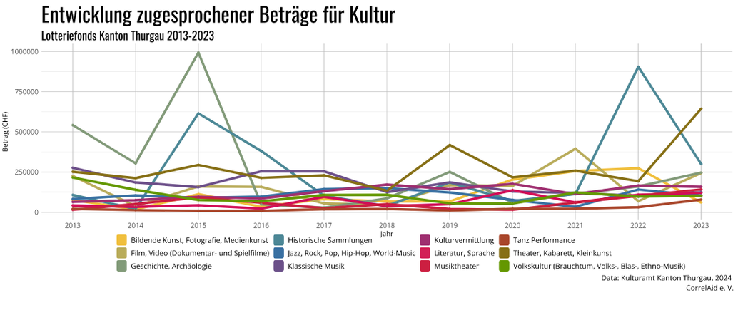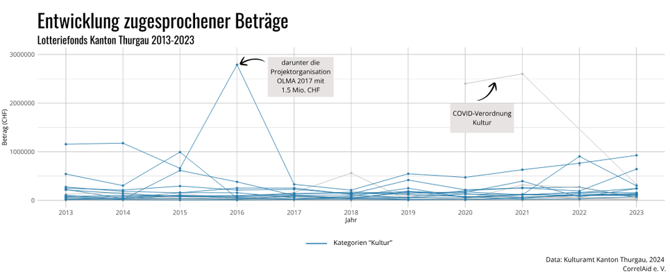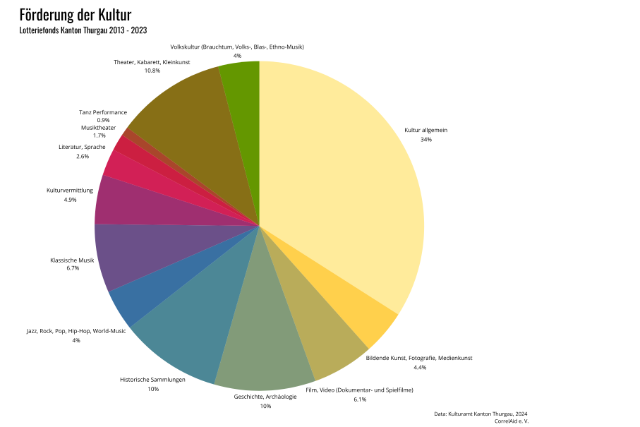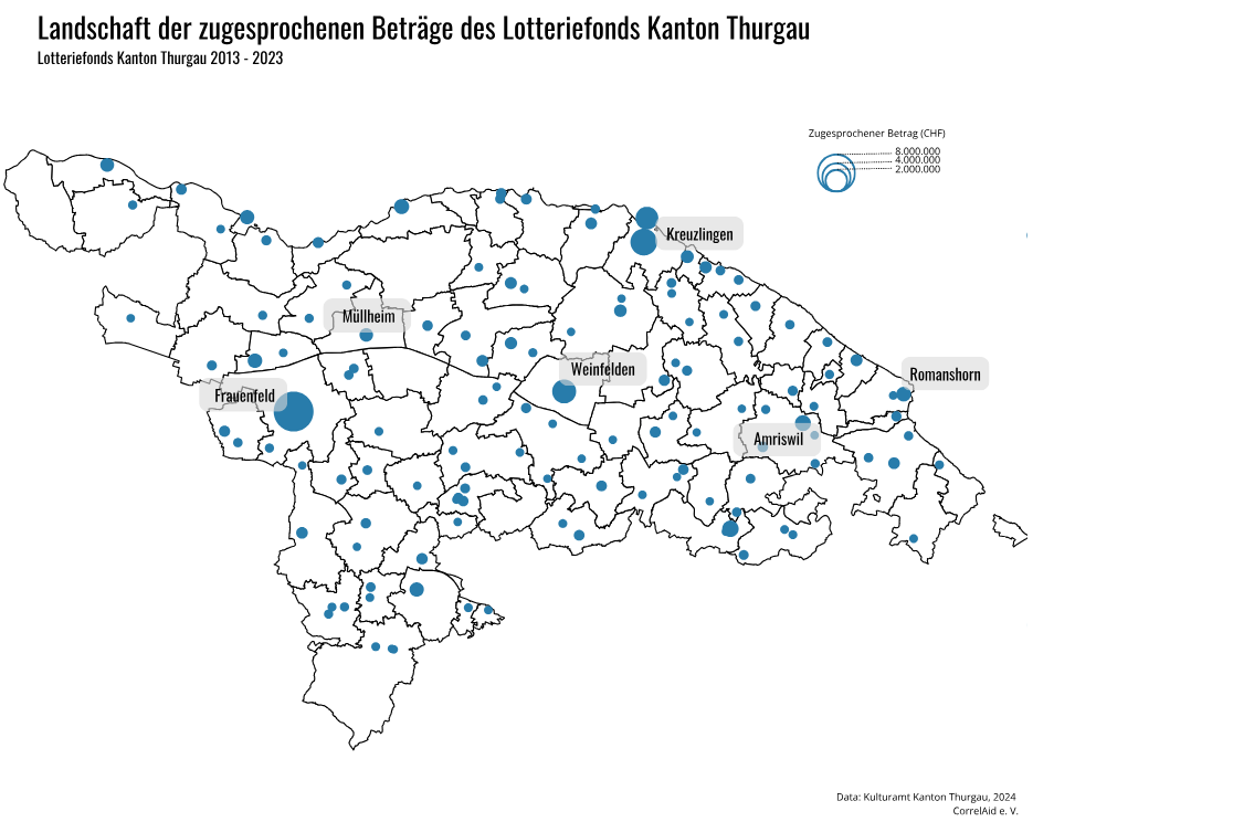 Ebenfalls aus dem Lotteriefonds werden übrigens die Kulturstiftung des Kantons Thurgau (1,5 Millionen Franken pro Jahr) und die Denkmalpflege (2,5 Millionen Franken pro Jahr) finanziert. Diese spielen in unserer Analyse aber keine Rolle. Details dazu gibt es aber im aktuellen Kulturkonzept des Kantons.