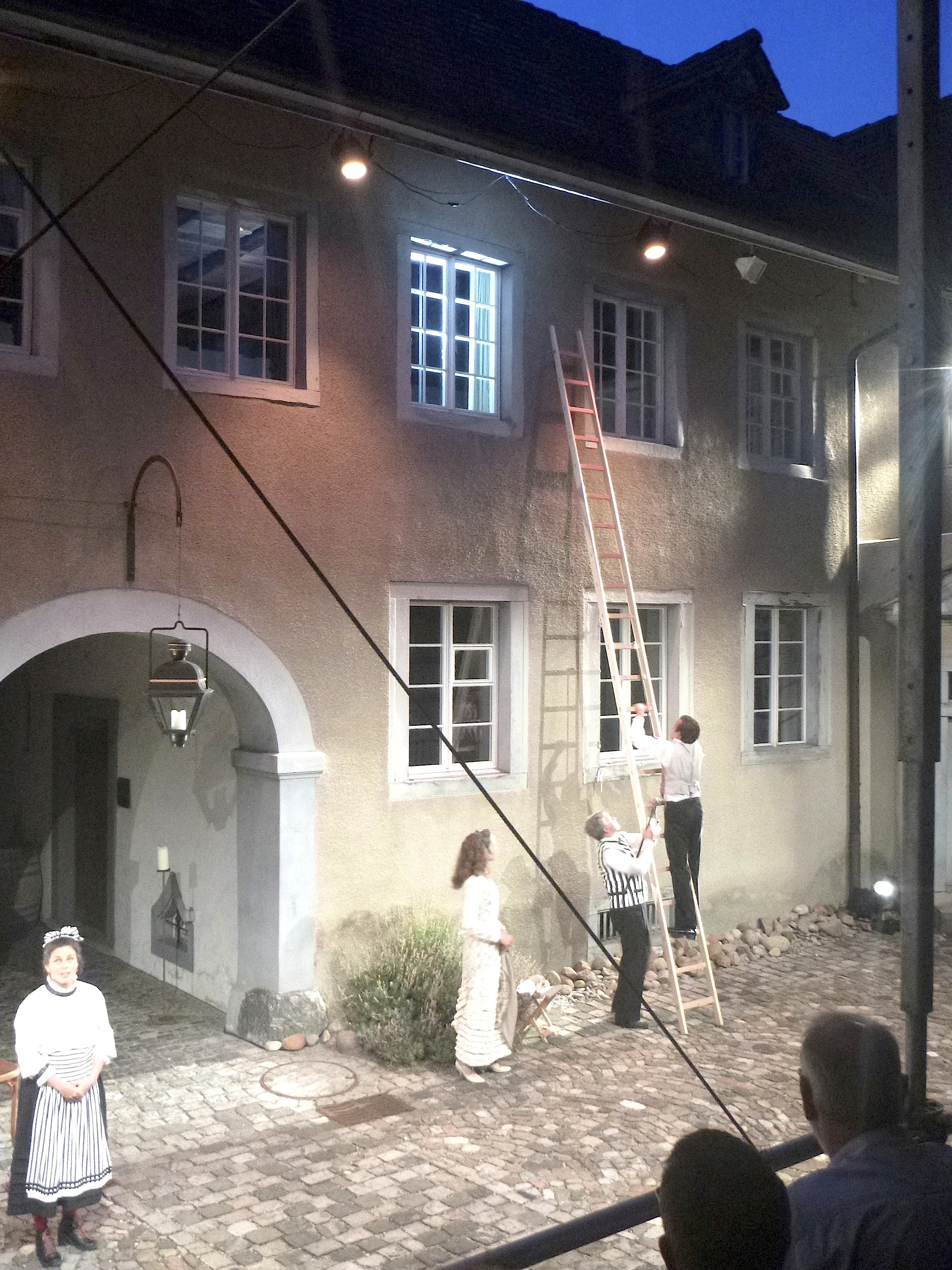 Im Hof des Greuterhofs steht eine Tribüne für 100 Zuschauer. Der Platz davor ist die Bühne für dieses „Kammertheater, unter freiem Himmel“, die rau verputzte Wand dient als Kulisse. Ein Durchgang führt in die Dunkelheit und ins Innere des Gebäudes. Mehr braucht es nicht. Das Dienstmädchen Mary und der Butler Poole rollen Teppiche aus, Tische kommen dazu und Stühle, schon sind die einzelnen Räume für das Spiel hergerichtet.