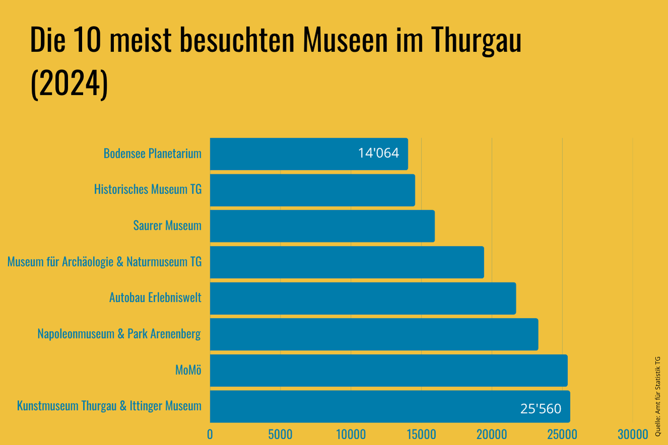 Die grössten Publikumsmagnete waren 2024 – ähnlich wie in den Vorjahren – das Kunstmuseum Thurgau und das Ittinger Museum (rund 25’600 Eintritte), sehr dicht gefolgt vom MoMö Mosterei- und Brennereimuseum Möhl in Arbon (25'381).