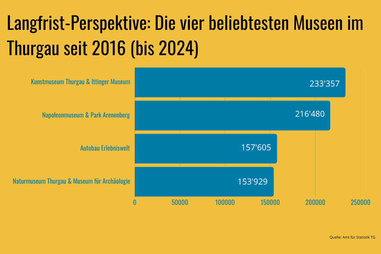 Zweit- und drittplatzierte Museen in dieser Langfristbeobachtung waren das Napoleonmuseum und Park Arenenberg (216’480 Besucher:innen) und Autobau Erlebniswelt (157’605 Besucher:innen) in Romanshorn. Auf den weiteren Plätzen folgen das Museum für Archäologie und Naturmuseum Thurgau, MoMö Mosterei- und Brennereimuseum Möhl sowie das Saurer Museum Arbon.