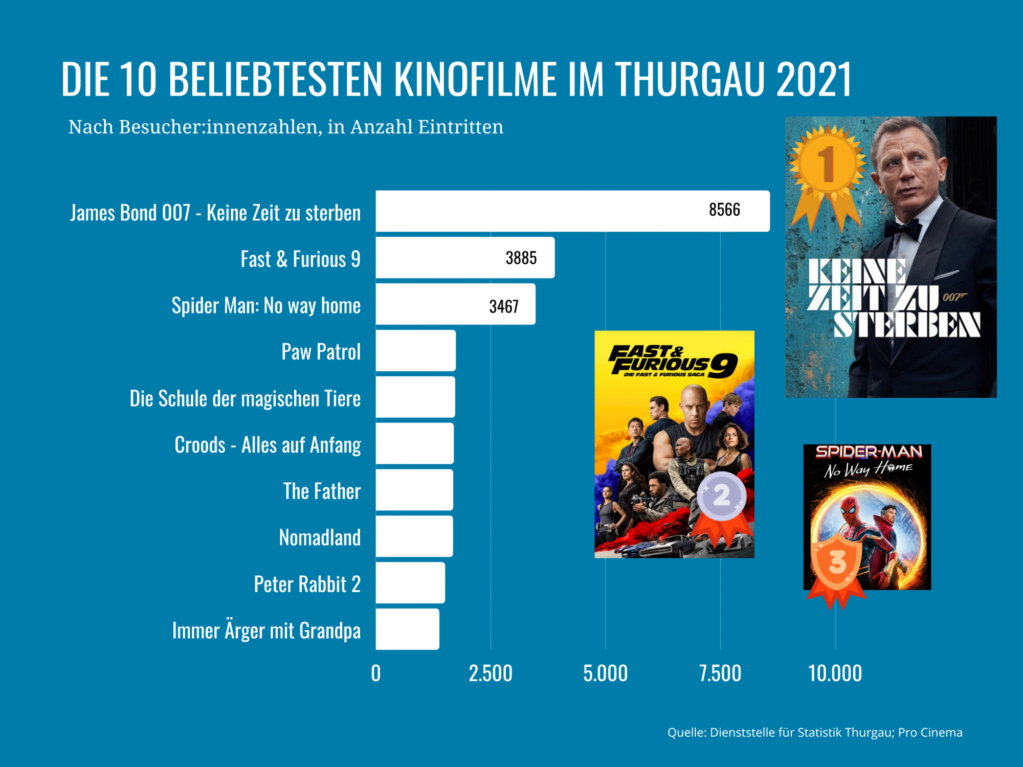 Der erfolgreichste Film 2021 war der neuste James-Bond-Film «Keine Zeit zu sterben». Dieser lockte nach Angaben der kantonalen Dienststelle für Statistik rund 8'600 Besucherinnen und Besucher in eines der Thurgauer Kinos. Auf den Plätzen 2 und 3 folgten demnach die Filme «Fast & Furious 9» und «Spider-Man: No Way Home».