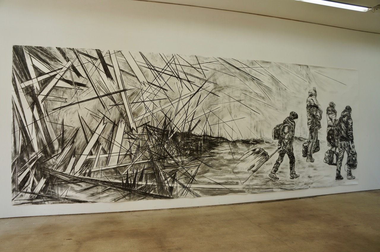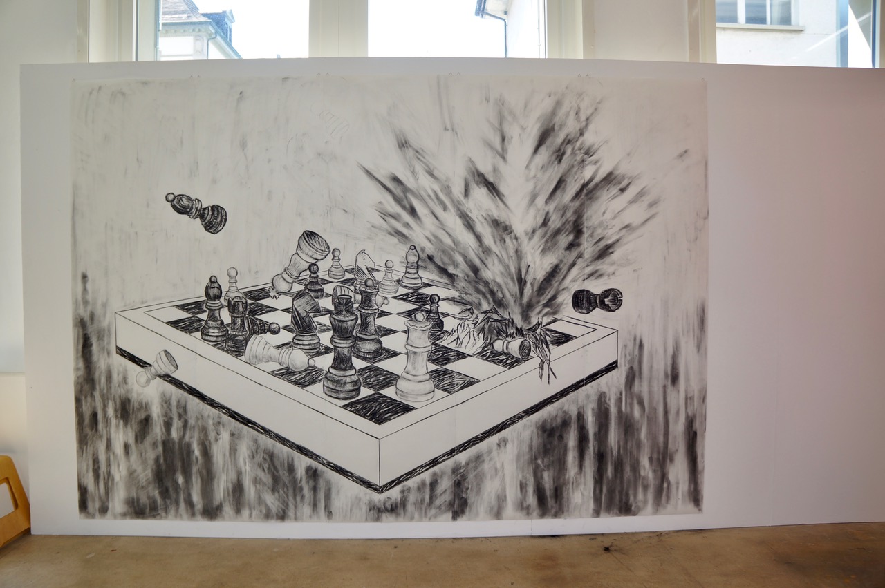 An der Wand gegenüber explodiert ein Schachbrett. Wird es von aussen zerschossen oder zerstört es sich selbst? So oder so ist die Strategie dahin. Die Figuren als Sinnbild für die Gesellschaft werden mit Gewalt umgeordnet.