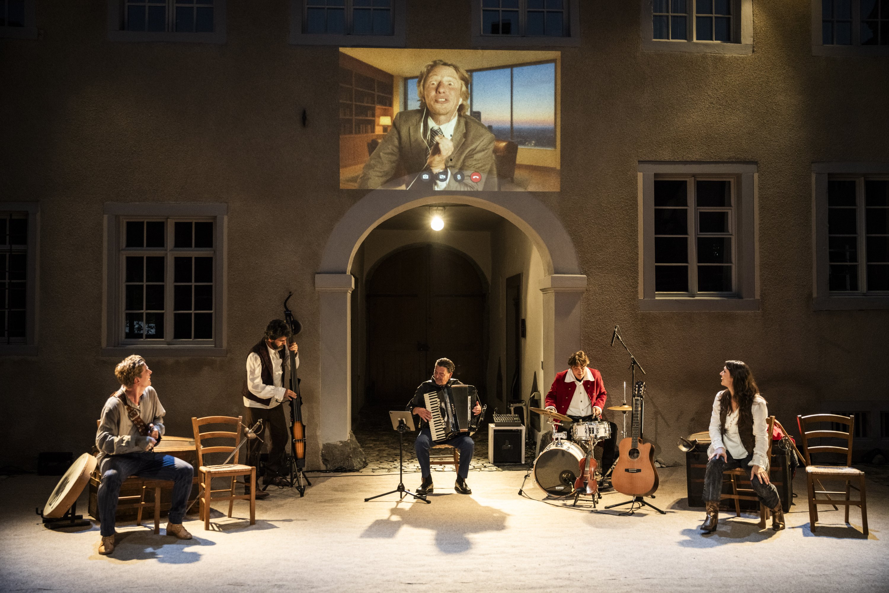 Dass das die Wände des Innenhofs zum Beben bringen kann, hat auch mit Goran Kovačevićs Musik am Akkordeon zu tun, die erheblich an der Inszenierung beteiligt ist, mal mit historischen Interpretationen, aber auch mit Kovačevićs eigenem grossartigen Sound.