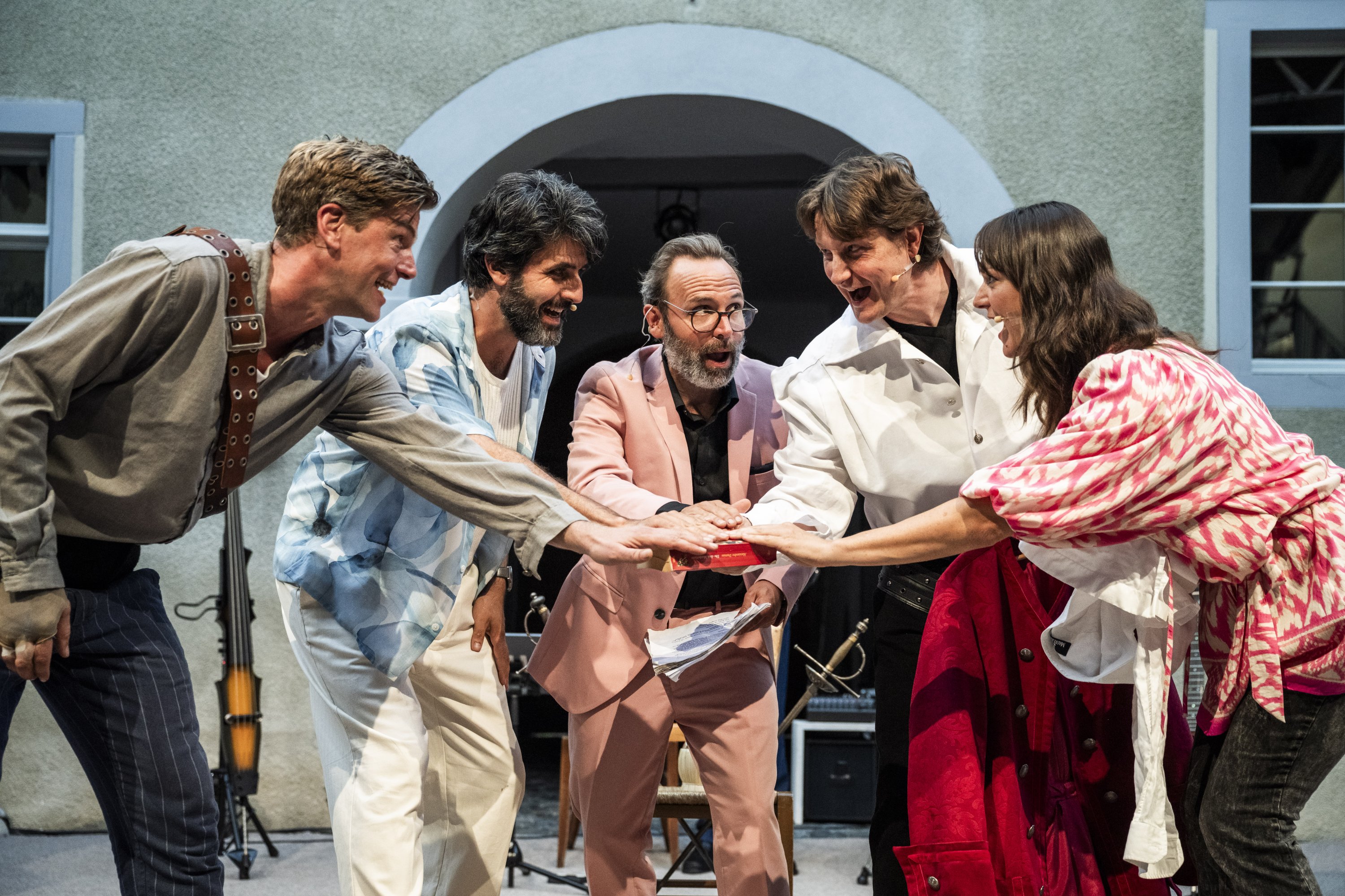 Das war so nicht absehbar, da die Theaterleute in ihrer Sommerinszenierung noch eine Zusatzebene eingebaut haben, was die Sache oft nicht einfacher macht: eine Spassebene, die darauf zurückgeht, dass drei von ihnen das Stück in der Vergangenheit bereits gezeigt und am Ende ankündigt haben, sich nach 20 Jahren nochmals zum selbigen Spiel zu treffen. Und da sind sie nun wieder vereint, nicht wie damals im Teatro Dimitri in Verscio, sondern eben im Greuterhof. Hübsch ist das mit dem kleinen Ausschnitt von früher auf der Hauswand, den Noce Noseda auf einem bereits weggelegten Camcorder gefunden hat.
