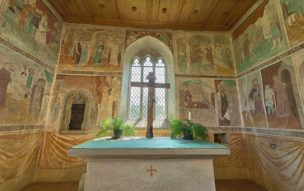 360-Grad-Bilder ergänzen die Informationen zusätzlich. Drei Innenräume von Thurgauer Bauwerken können bisher auf diese Weise erkundet werden: der Salon im Schloss Berg, die St. Leonhardskapelle in Landschlacht und die Klosterkirche in Münsterlingen.