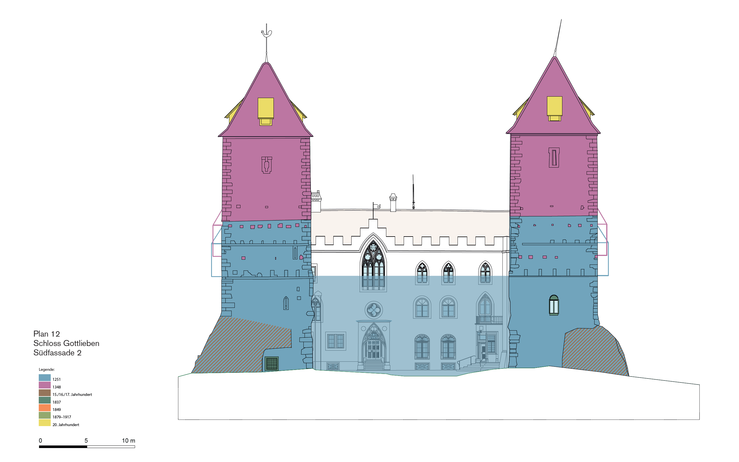 Zum anderen die grundlegenden Umbauten von 1836/38 zu einem venezianisch anmutenden Palazzo mit Hauptgebäude im Norden, kleinerem Osttrakt und einer Verbindungsmauer zum Westturm. Gemeinsam mit den Türmen ergibt sich der noch heut bestehende U-förmige Grundriss mit offenem Hof gegen Süden.