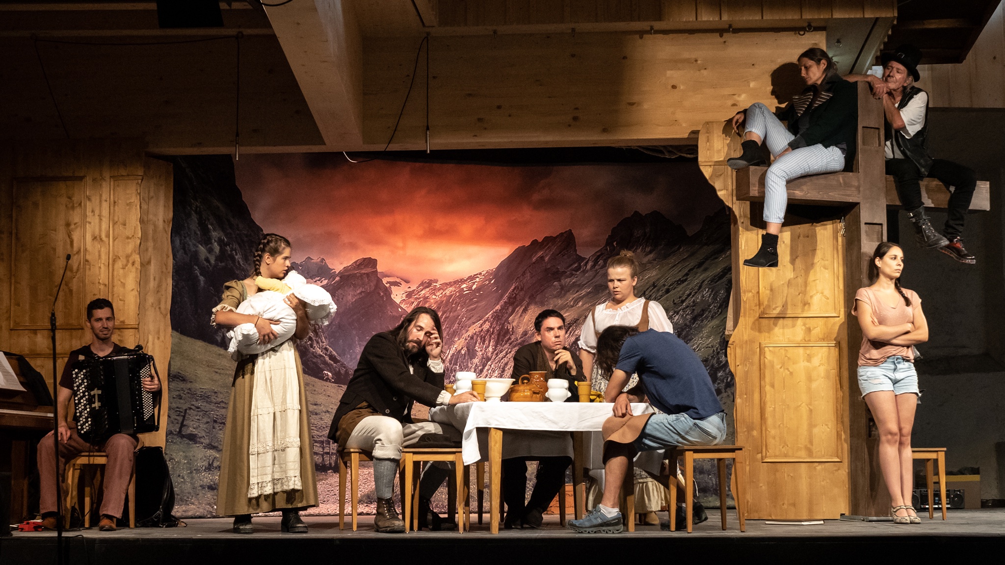 Ein Dienstagabend in Hagenwil. Es ist einer dieser schwül-heissen Sommertage, die im gefühlten 2-Stunden-Rhythmus zwischen Tropenklima und monsunartigen Regenfällen wechseln. Florian Rexer steht in schwarz-weissen Bermudashorts, schwarzem T-Shirt und grauen Slippern vor seinem Ensemble. „Wir haben noch eine Woche bis zur Premiere, ich möchte in den nächsten Tagen ein bisschen Putzarbeit machen, also das Stück bereinigen, so dass wir es in eine stimmige Version bekommen“, sagt der Regisseur.