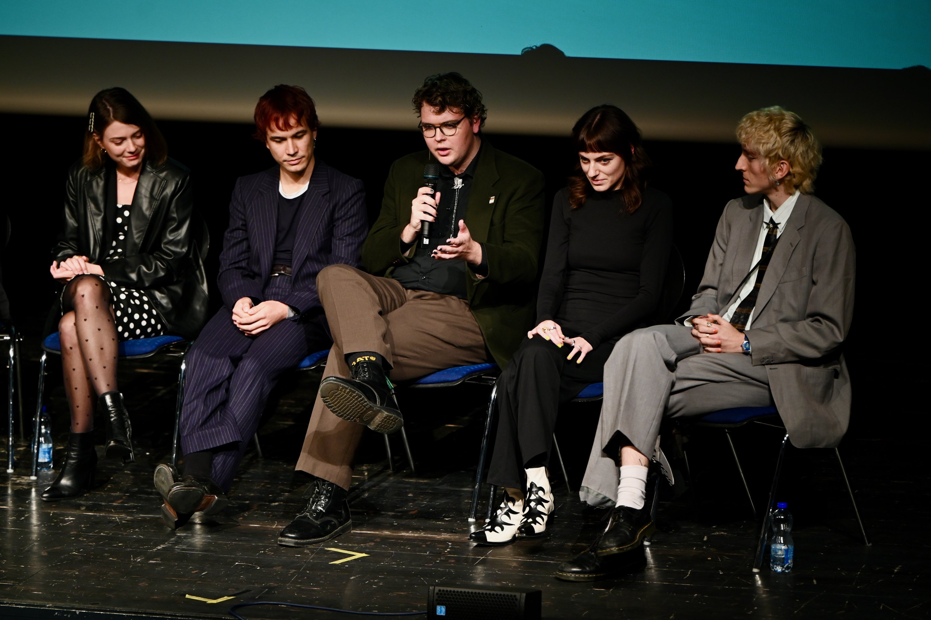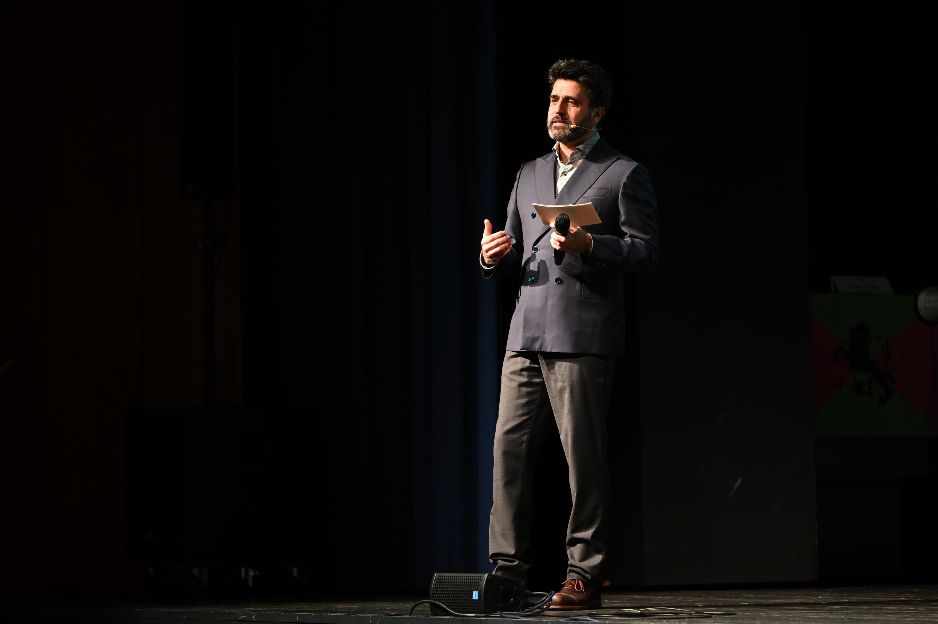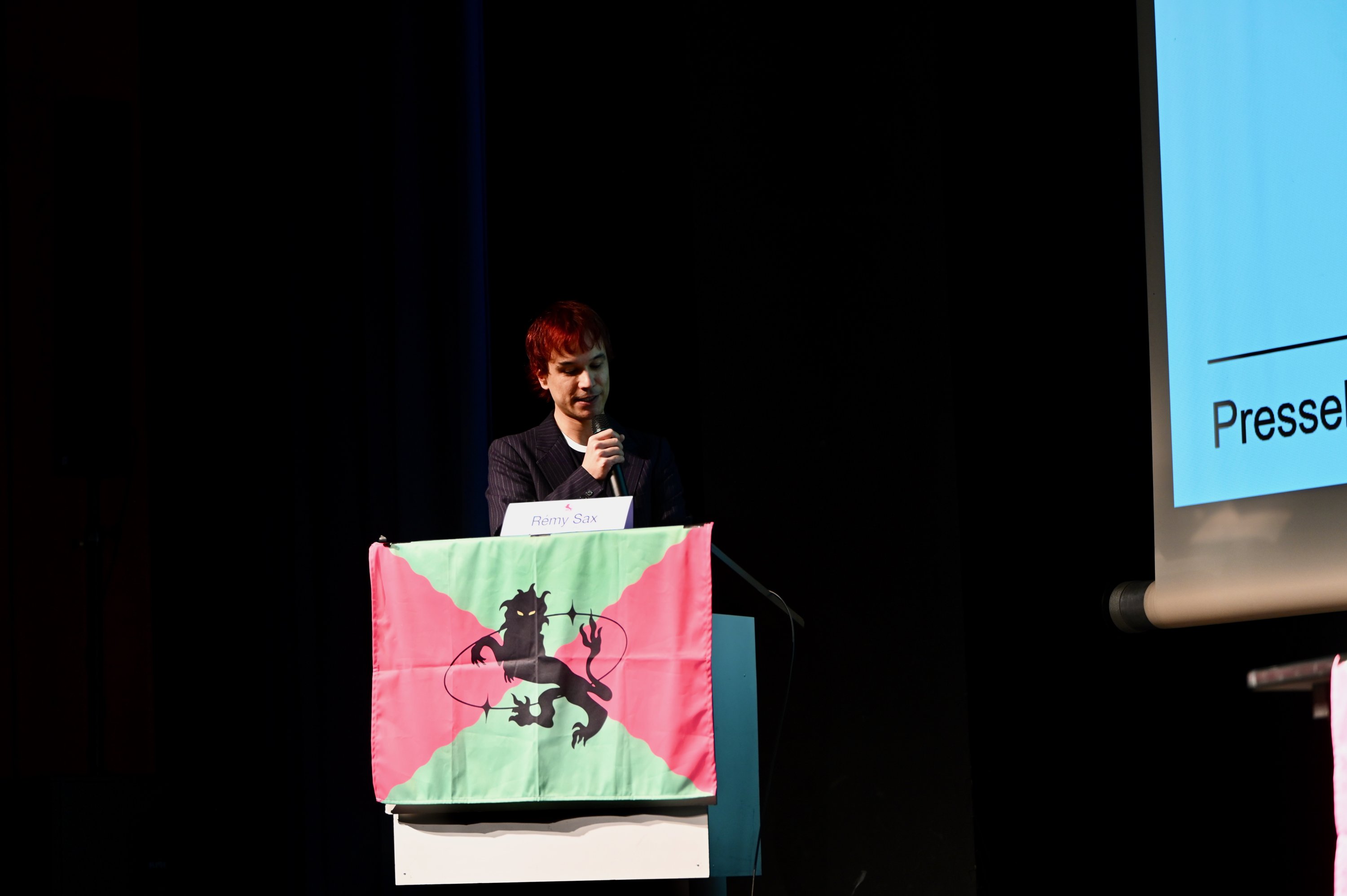 Teil des Bühnenbilds war eine Flagge, die sich die Kulturbotschafter:innen schon selbst geschaffen hatten: zwei grüne Dreiecke, zwei bordeauxrote, leicht ins Magentafarbene changierende Dreiecke, darauf ein schwarzer, eher finster dreinblickender Löwe mit scharfen Krallen und einem ellipsenförmigen Kreis um sich. Klares Signal: Mit diesem Löwen legst du dich besser nicht an.