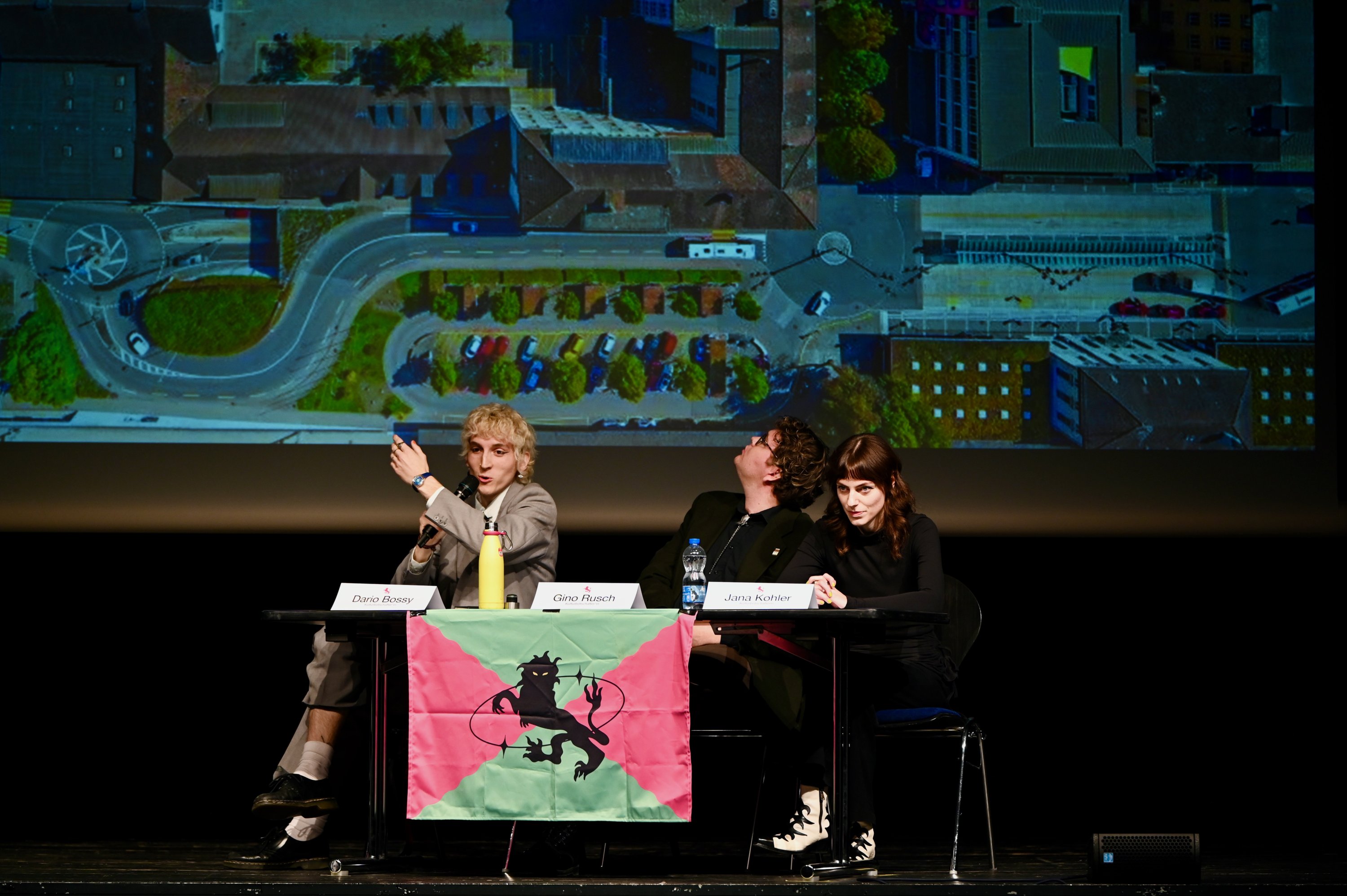Die Sieger:innen Dario Bossy, Jana Kohler, Gino Rusch und Rémy Sax von der Kulturbotschaft hatten sich für ihre Präsentation im Finale einen speziellen Rahmen ausgedacht – sie inszenierten die Vorstellung als Pressekonferenz, bei der sie nicht nur die Grundzüge ihrer Idee erklärten, sondern auch erwartbare Fragen aus dem Publikum («alles nur heisse Luft?») direkt selbst beantworteten.