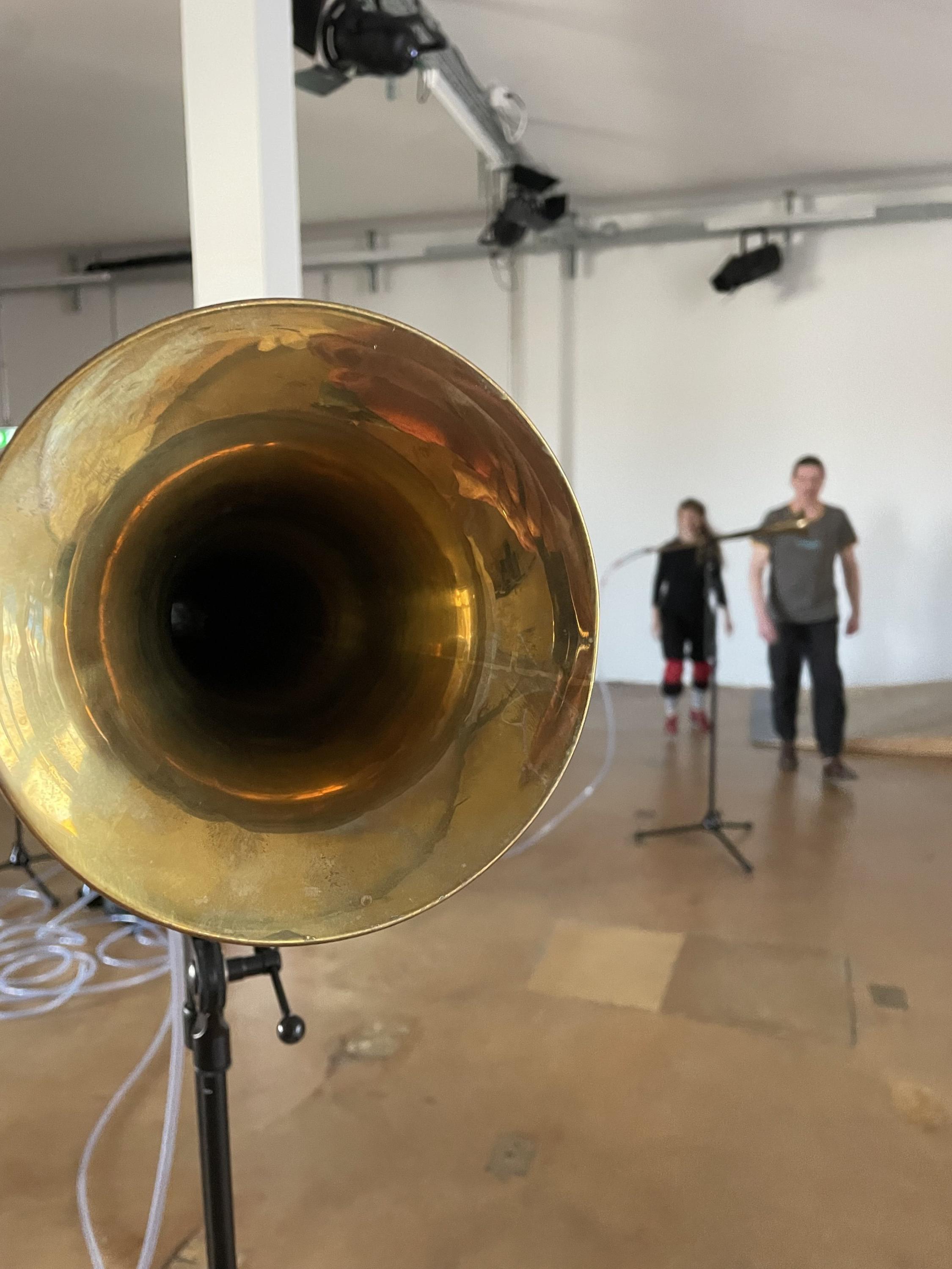 Zwischen ihnen steht eine Musikinstallation von Christoph Luchsinger: vier Trompeten, verbunden mit handelsüblichen Schläuchen. Wer schon einmal bei einer NOEISE-Ausgabe war, erkennt den Aufbau vielleicht wieder. Geräusche, Klang, Musik – alles hängt zusammen. Alles kann dasselbe sein – oder eben auch nicht. Diese Unvorhersehbarkeit ist vielleicht der Wesenskern, der die früheren Projekte von Christoph Luchsinger mit jenen von Micha Stuhlmann verbindet und die beiden nun zusammenführte.