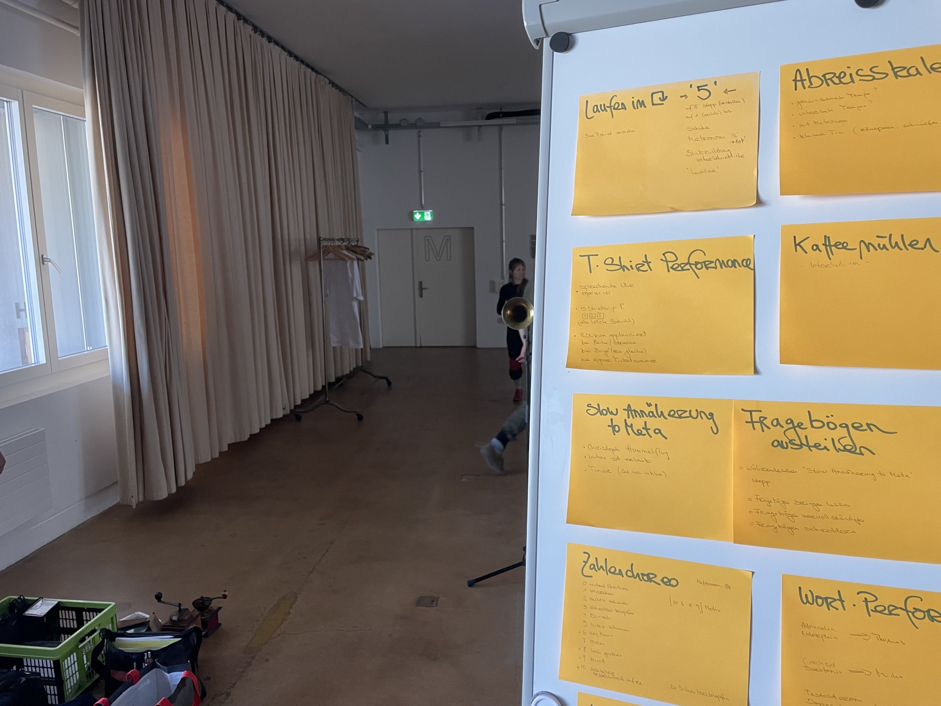 Im Angesicht dieser Unsicherheit wirkt der Probenprozess fast schon überstrukturiert. Wie in einem ganz normalen Büromeeting sind auf einer Flipchart orangefarbene Post-its geklebt. Darauf stehen Schlagworte wie „T-Shirt-Performance“, „Meta-Verschiebung“, „Urmelodie“ und „Kaffeemühlen“. Darunter notiert sind Fragen („gemeinsames Tempo?“) und Anweisungen („Schenkel klopfen“). Es ist das noch sehr fragile und flexible Grundgerüst dessen, was da in den nächsten Wochen entstehen soll – mögliche Wachstumsschmerzen eingeschlossen.