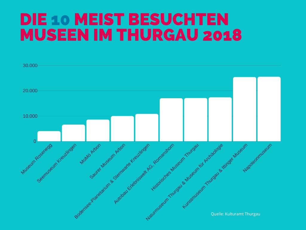 Interessant an diesen Ergebnissen sind vor allem zwei Dinge: Erstens: Museen, in denen man etwas erleben kann, wie die Autobau Erlebniswelt, das Saurer-Museum oder das MoMö, haben einen besonderen Zulauf. Zweitens: Es scheint neben Frauenfeld mit seinen kantonalen Museen zwei weitere Museums-Hotspots im Kanton zu geben: Kreuzlingen und Arbon. In beiden Städten gibt es jedenfalls besucherstarke Häuser.
