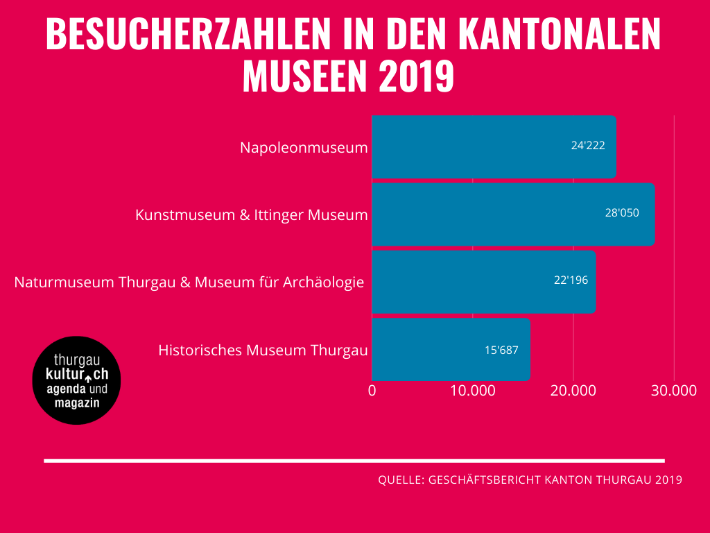 Wie schnell sich die Besucherzahlen auch wieder drehen können, zeigen Zahlen aus dem Jahr 2019 für die kantonalen Museen. Im Geschäftsbericht des Kantons Thurgau werden diese Daten genannt. Demnach war 2019 das Kunstmuseum Thurgau & Ittinger Museum das mit Abstand meistbesuchte Museum des Kantons mit 28’050 BesucherInnen.