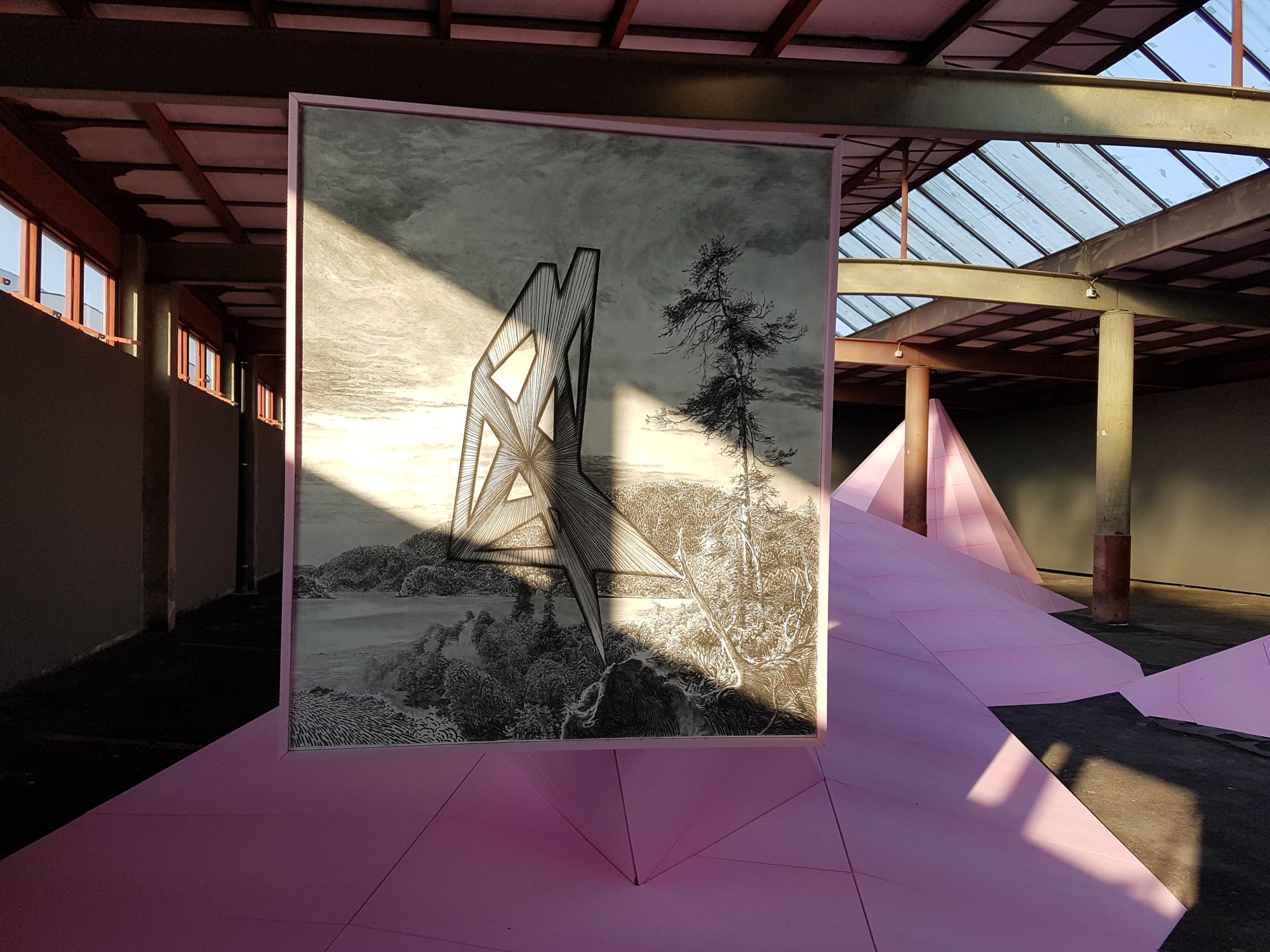 Heiko Blankenstein stört diese idealisierte Vorstellung mit den futuristischen geometrischen Formationen. Sind wir bereits in einer Dystopie angekommen? Ist unser Verhältnis zur Natur bereits gescheitert? Er gibt uns keine direkte Antwort auf diese Fragen und schafft dadurch eine intelligente Arbeit, die der Betrachter selbst mit Interpretationen füllen kann.