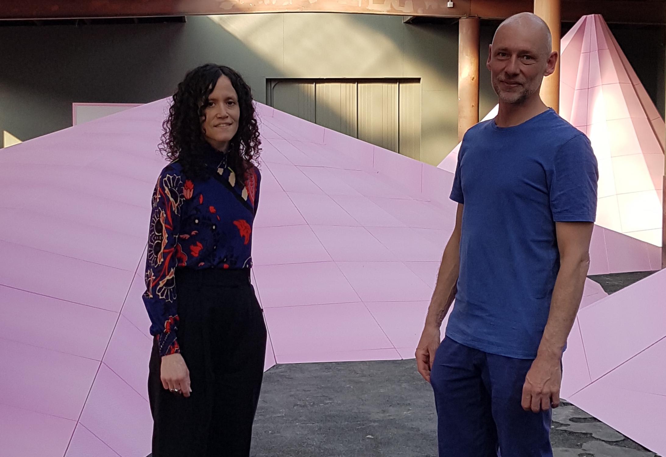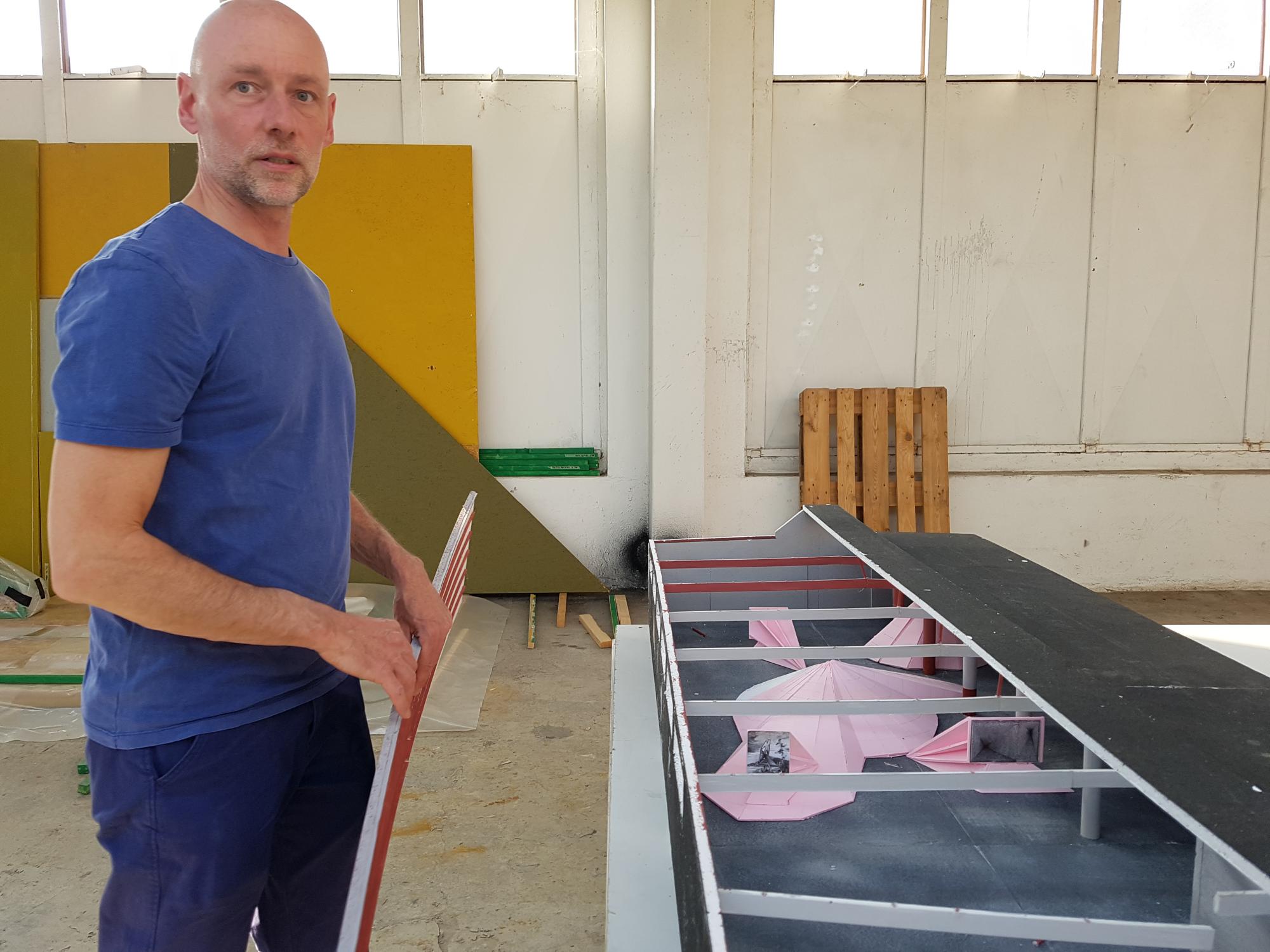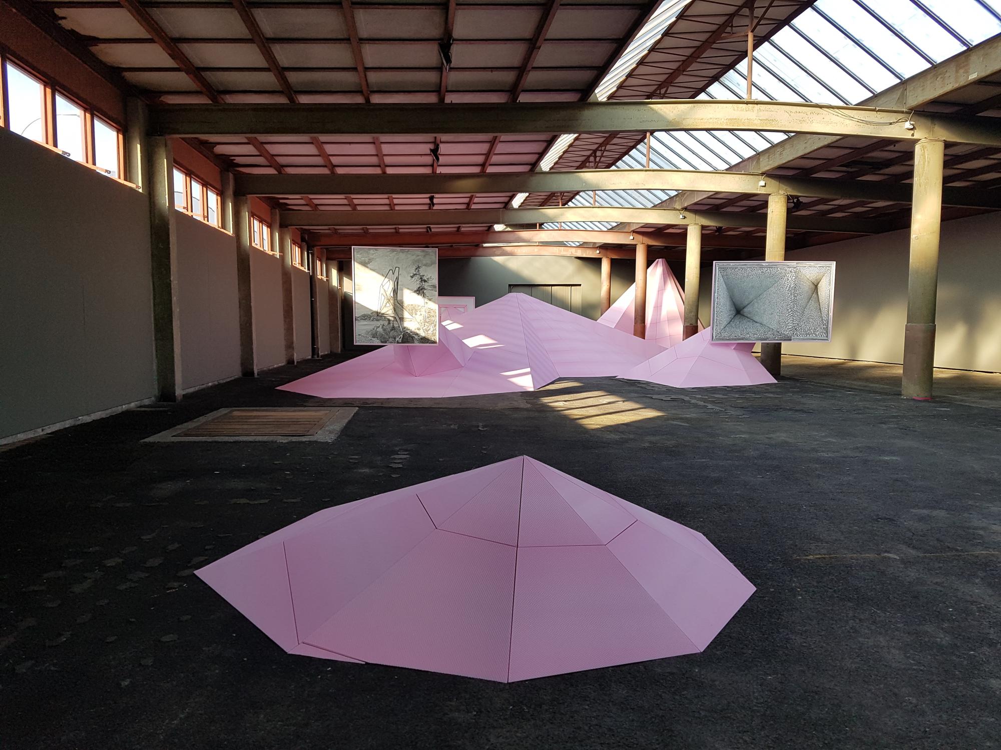 Das rosa Dämm-Material wurde in minutiöser Kleinstarbeit vom Künstler über Monate passgenau auf den Raum zugeschnitten, dabei gleicht keine Platte einer anderen. Die neue fast schon futuristische Welt nimmt die Halle ein und schafft, was ortsspezifische Arbeiten im besten Fall tun sollten: es gibt eine spannende Liaison zwischen dem Ort und der Arbeit.
