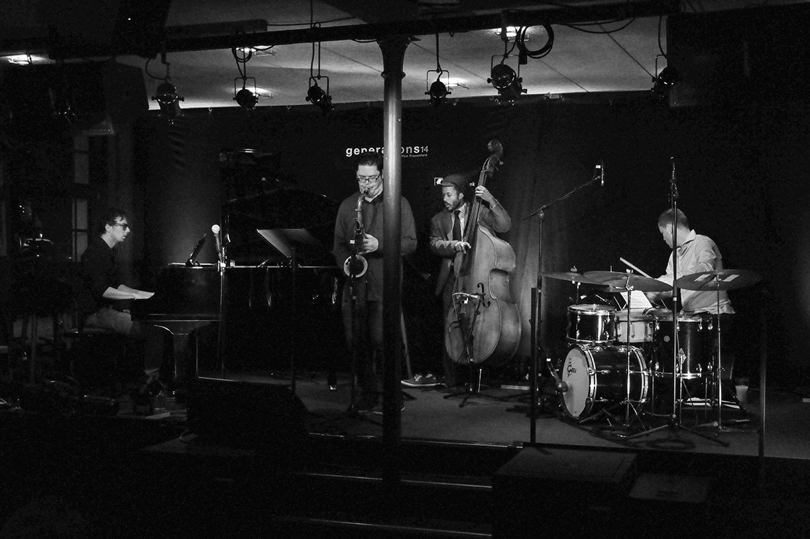 Marko Crncec (p), Seamus Blake (ts), Joe Sanders (b) und Vladimir Kostadinovic (dr) machen im Dreiegg einen Live-Mittschnitt auf für ihre neue CD-Produktion (von links).