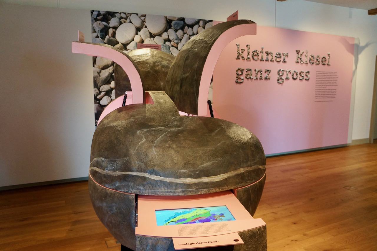 Äusserlich sind die Ausstellungs-Module real existierenden Kieseln nachempfunden. Die wenige Zentimeter grossen Originale kann man unten im Empfang des Naturmuseums sehen. Die rosarote Farbgebung der eingebauten Schatullen verstärkt den Schatzkisten-Effekt. Die Steinchen leuchten.