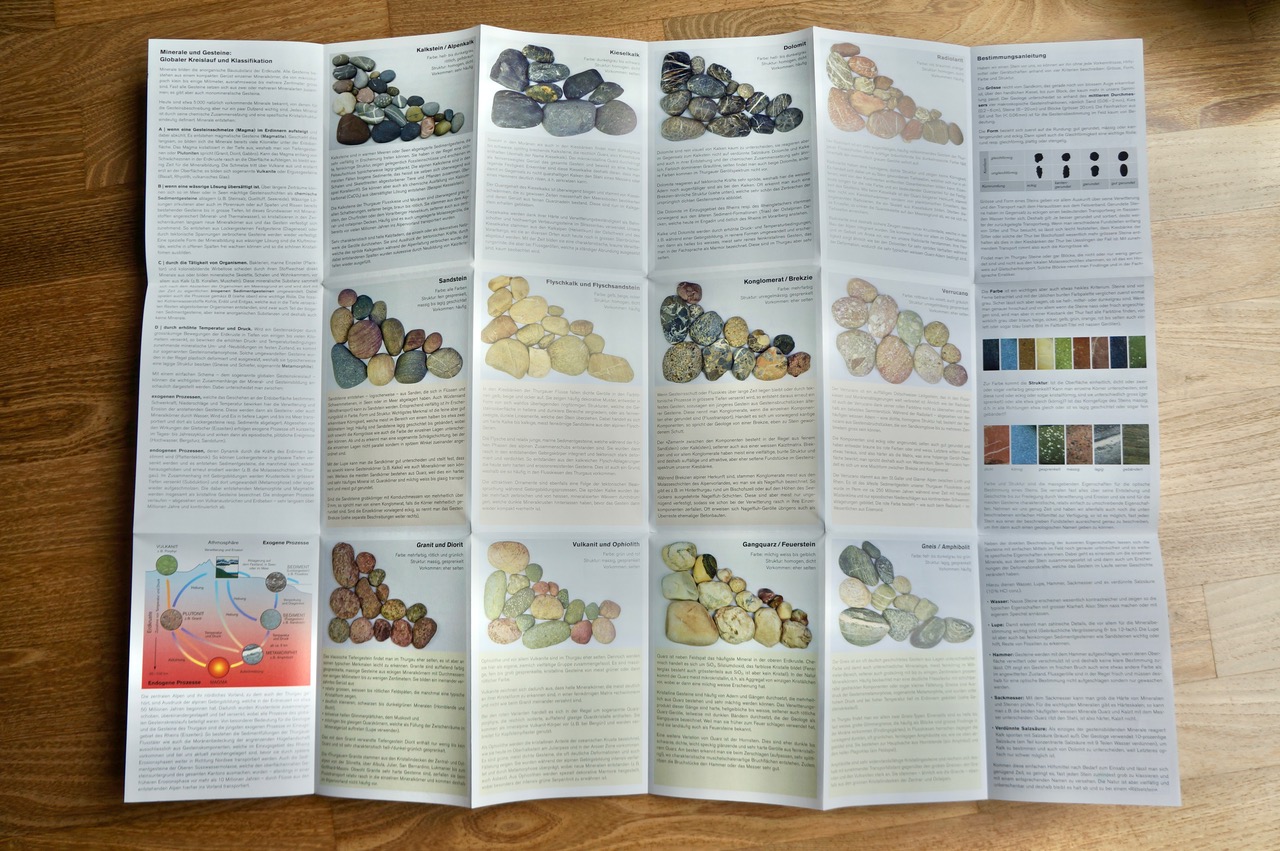 Dann geht es um die Details: Wie kommen die Muster in den Stein? Eine Animation erleichtert hier das Verstehen: Durch tektonische Kräfte entstehen Klüfte im Gestein. Wasser, in dem Mineralstoffe wie beispielsweise Kalk gelöst sind, dringt ein. Sie kristallisieren im Laufe der Zeit aus. Und schon nach ein paar Millionen Jahren Erosion hat man einen dunklen Kieselstein mit weissen Linien.