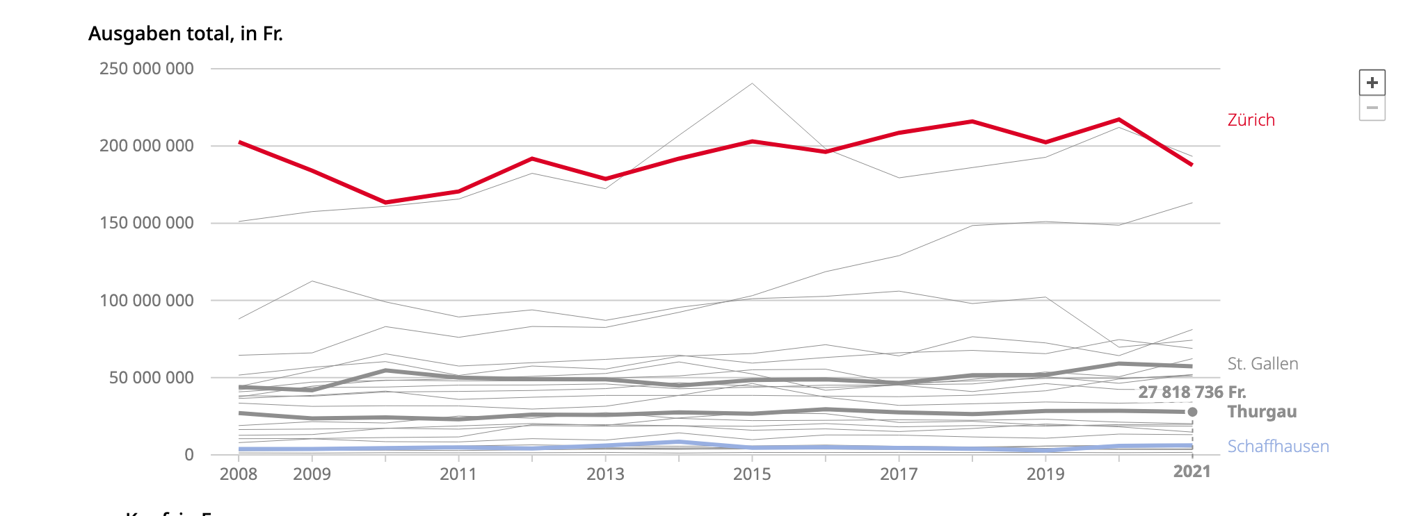 Allerdings sind diese Zahlen etwas verzerrend, weil die Kantone unterschiedlich strukturiert und verschieden stark bevölkert sind. Deshalb ist die Zahl der Pro-Kopf-Ausgaben, also wie viel Franken investiert der Kanton pro Einwohner, oft aufschlussreicher.