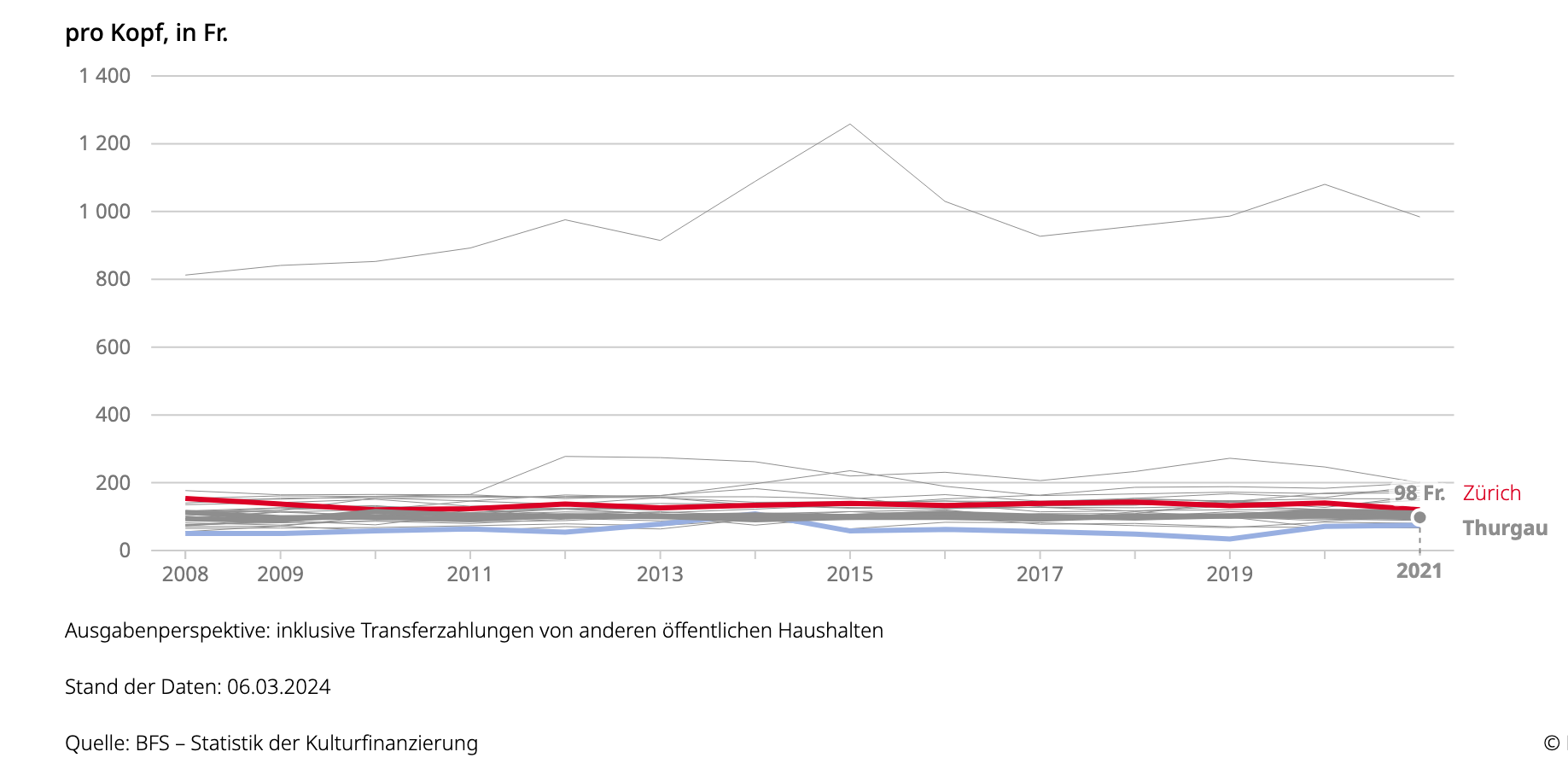 Mit 98 Franken pro Einwohner unterstützt der Thurgau seine Kultur (2021) und liegt damit in Reichweite zum Nachbarn aus St. Gallen (111 Franken). Schaffhausen berappt 74 Franken pro Kopf für sein Kulturleben. Basel-Stadt liegt in der Rangliste unangefochten vorne mit fast 984 Franken pro Einwohner. Zürich liegt bei 120 Franken pro Einwohner.