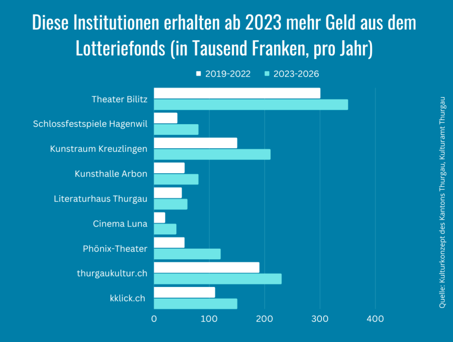 Höher dotierte Leistungsvereinbarungen erhielten damals unter anderem die Kulturstiftung des Kantons Thurgau (1,5 Millionen Franken pro Jahr), das Phönix-Theater Steckborn (120’000 Franken), der Kunstraum Kreuzlingen (210’000 Franken), die Schlossfestspiele Hagenwil (80’000 Franken) und thurgaukultur.ch (230’000 Franken) Eine Übersicht zu einigen erhöhten Leistungsvereinbarungen gibt es in der Grafik.