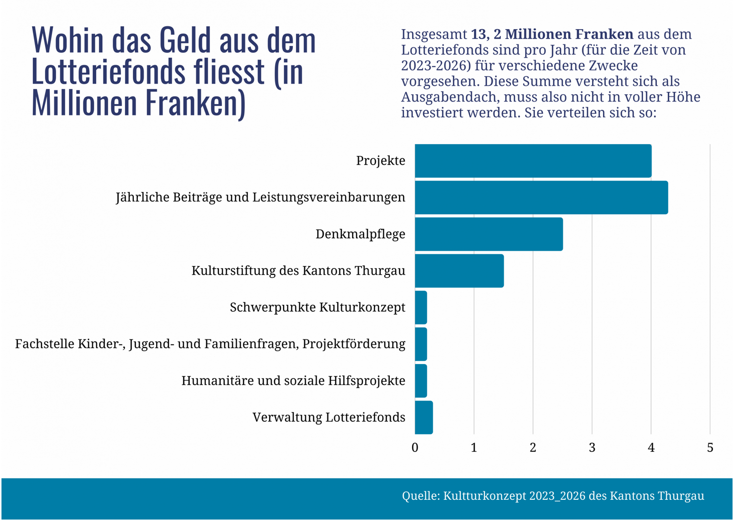 Die grösste Einzelsumme (2,5 Millionen Franken pro Jahr) fliesst in die Denkmalpflege, danach folgt die Kulturstiftung des Kantons Thurgau (1,5 Millionen Franken).