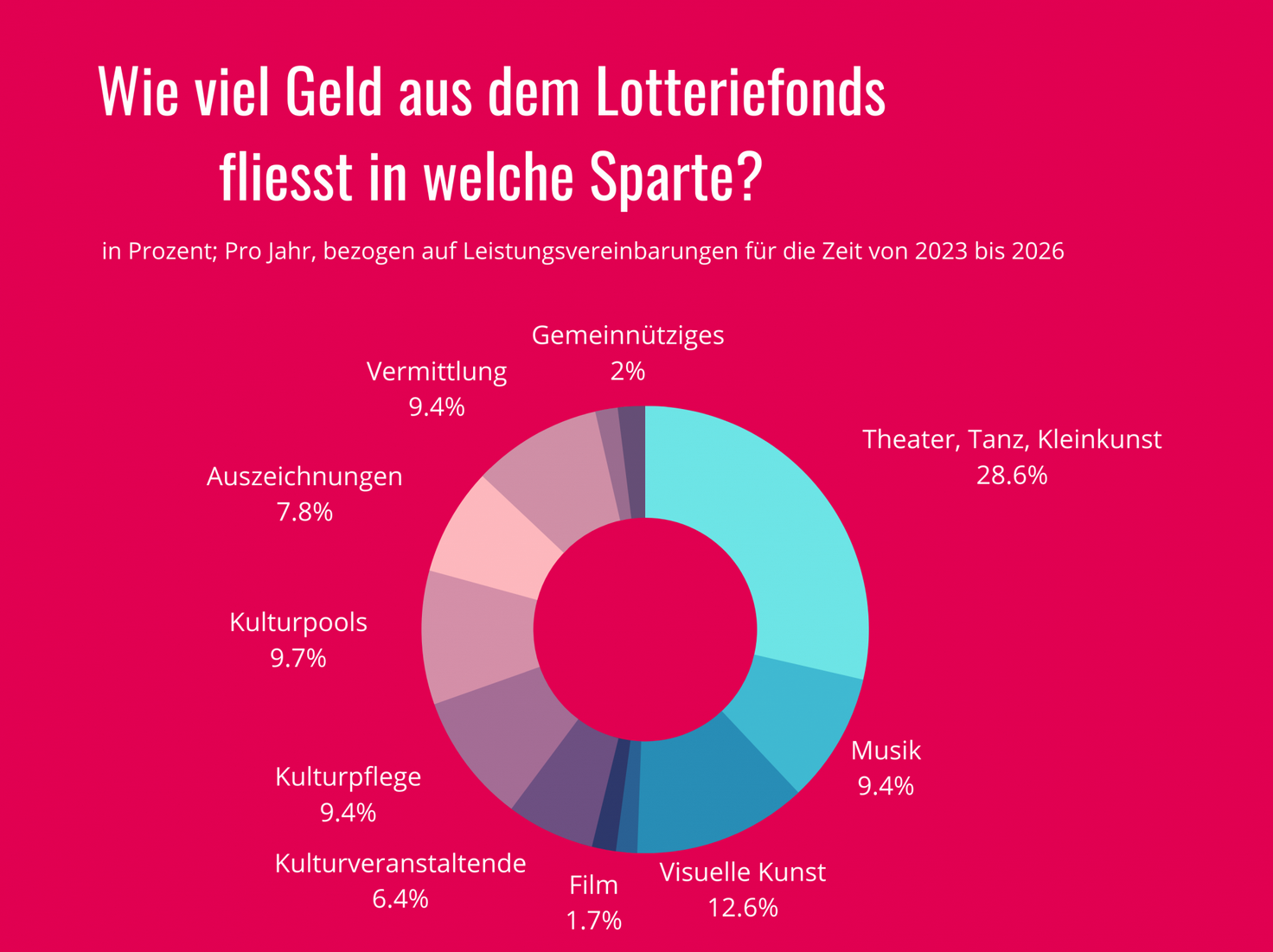 Eine Analyse der Daten zeigt auch, welche Sparte besonders von den Zahlungen aus dem Lotteriefonds (bezogen auf die mehrjährigen Leistungsvereinbarungen): Knapp 29 Prozent der Gelder (1,2 Millionen Franken) fliessen in den Bereich „Theater, Tanz, Kleinkunst“.