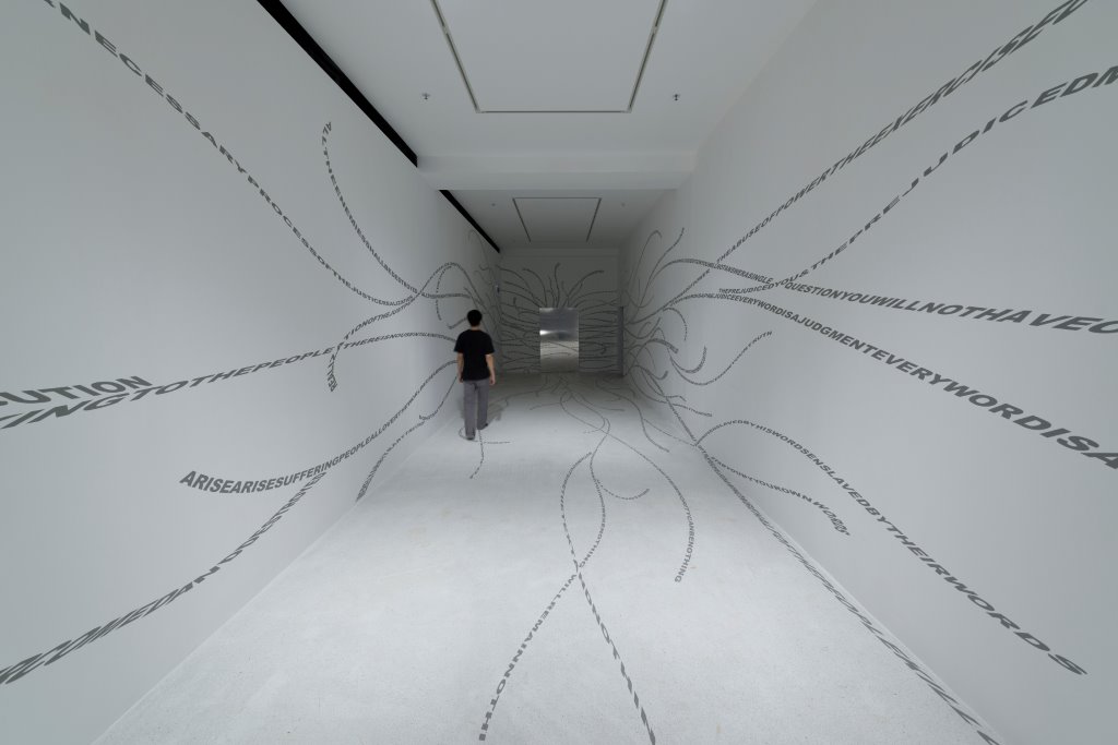 Auf den ersten Blick lässt nichts im Eingangsraum darauf schliessen, was einen in den übrigen drei Räumen der begehbaren Installation erwartet. Ästen und Zweigen einer exotischen Pflanze gleich schlängeln sich Linien über Wände und Fussboden, ziehen die Besucher lockend in ihren Bann. Erst auf den zweiten Blick erkennt man, dass einem hier nichts verheissen wird, ganz im Gegenteil: Die ornamental anmutenden Linien bestehen aus Buchstaben, Wörtern, Teilen von Sätzen, ohne Abstand, ohne Punkt und Komma aneinandergereiht. „Weaponsofmassdistorting“ liest man, „Thenecessaryweapons“ in Endlosschlaufe. Waffen für das Verzerren der Massen? Die nötigen Waffen?