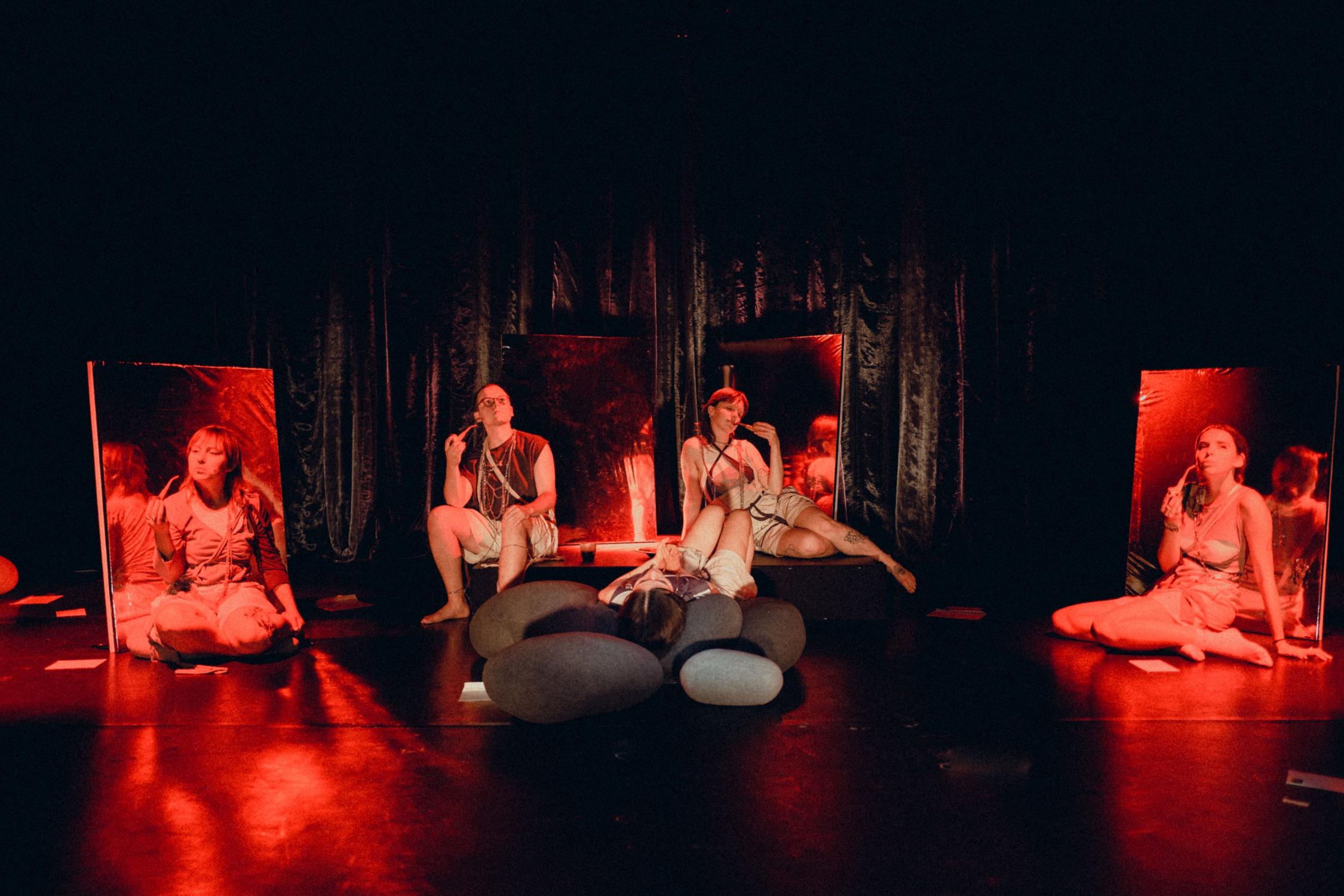 Regisseur Eric Scherrer bringt mit dem Ensemble aus Corine Fischer, Sarina Hess, Maksim Bitsch, Lily-Rose Demeulemeester, Sara Vivian Weber und Aleena Krähemann eine Reihe starker Einzelbilder auf die Bühne, die den Spielenden viel Platz lässt. Im Wesentlichen werden ein paar Kissen, die an Steine erinnern, als multifunktionale Requisiten für die Szenengestaltung genutzt. Und da ist noch der Gong, der die (Bühnen)Zeit in Einheiten fragmentiert.