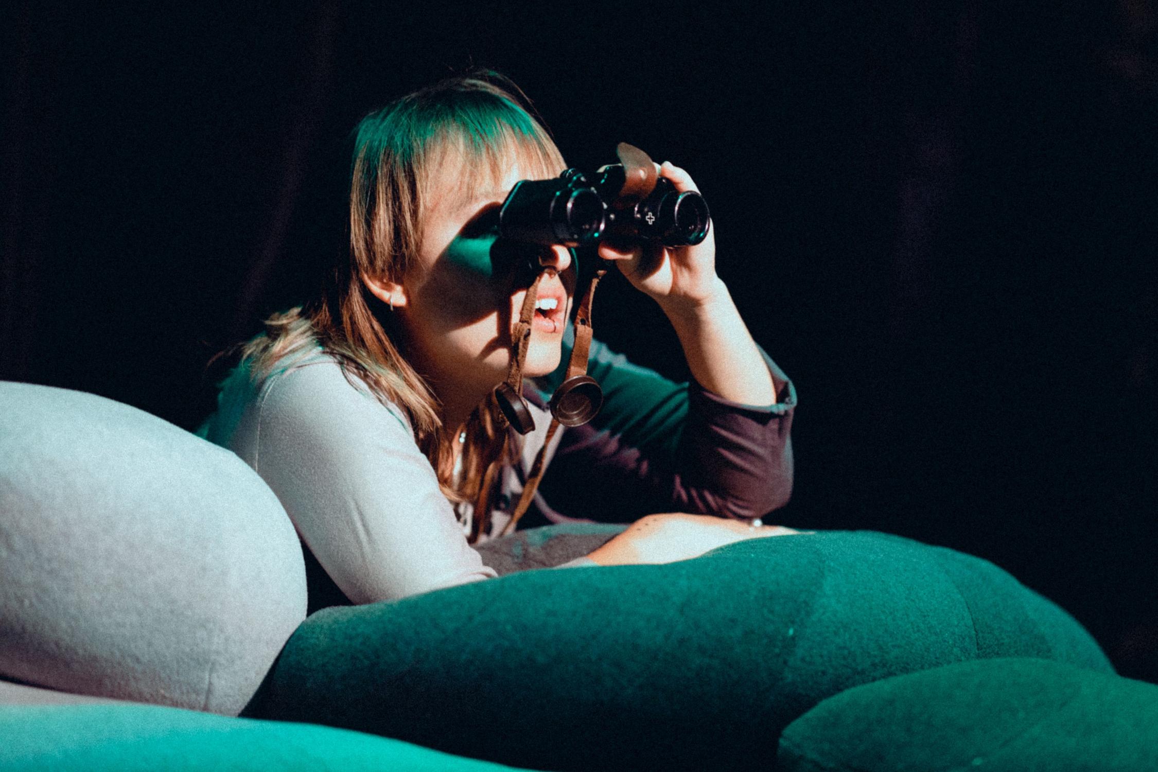 Und dann die Vogelschar. Einmal stehen alle da und machen mit den eckigen Kopfbewegungen von Vögeln deren Laute nach. Rufe in den Wald nach dem Anderen, während in der Ecke die Vogelkundlerin mit dem Fernglas und viel Spezialwissen aufwartet. Das Ensemble der Freien Bühne wäre nicht es selbst, wenn es nicht eine gute Prise Ironie und Humor mit einfliessen lassen würde. Auch dann, wenn es so berührend wird wie beim Kampf zweier Personen um Nähe und Distanz, wobei immer neue Grenzlinien auf dem Bühnenboden gezogen und wieder verwischt werden.