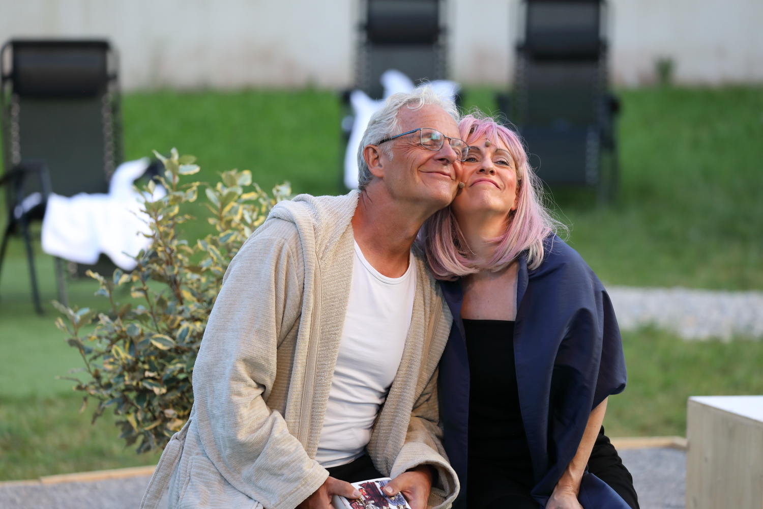 Während der historische Bruder Klaus also aufopferungsvoll, tapfer und ohne Rücksicht auf sich selbst, seinem Leidensweg folgt, wird Matteo Eggimann zu einer bekehrten Klischeefigur seiner selbst. Damit auch jede: Zuschauer:in seinen Wandel versteht, agiert er in weissen, gurugleichen Kleidern, er meditiert natürlich in seinem Garten und sein Glück findet er in Wohnmobilausflügen mit seiner Frau, die dann doch wieder zu ihm zurückgekehrt ist. Weil sich ja jemand, um die Ordnung kümmern muss, wie Sofia Eggimann (Regula Hutter) in einer Szene sagt und dabei Pizzakartons aufräumt. Die Gegenwart des Stücks wirkt in diesen Momenten seltsam gestrig.