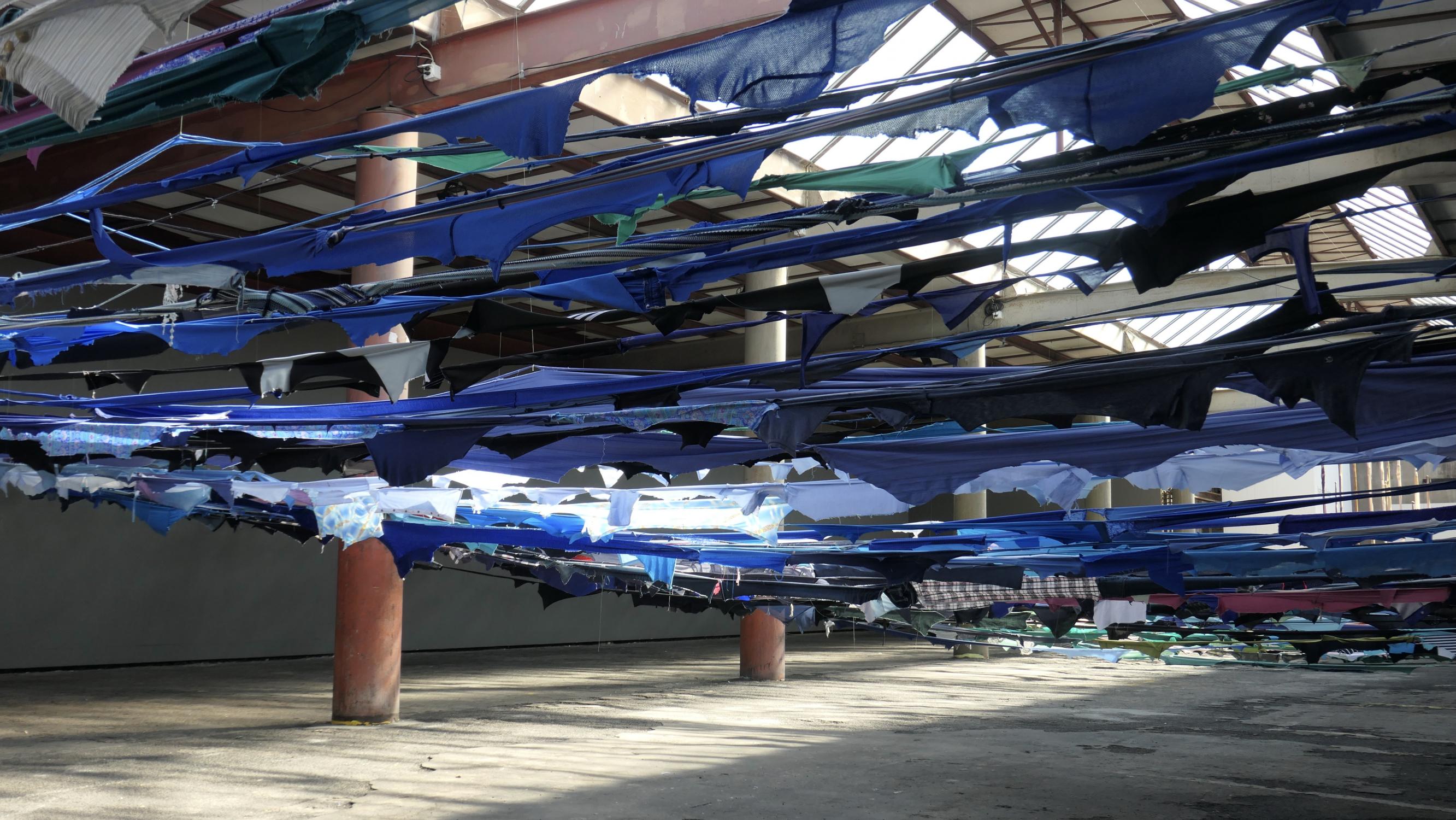 Schliesslich kann man am Ende der Halle einen gemütlichen Unterwasserspaziergang antreten. Der Übergang von höher gespannten Bahnen zum reinen Unterwasser-Erlebnis ist dabei die schwierigste Etappe. Entweder man setzt zu zu hohen Schritten an oder versucht, sich in noch seichter Tiefe gebückt unter den Bahnen vorwärtszubewegen. Hat man dann die Stoffdecke über sich, evoziert das etwas Schützendes. Der provisorische Charakter erinnere aber gleichzeitig an medial vermittelte Bilder von Flüchtlingscamps, führt Keller aus.