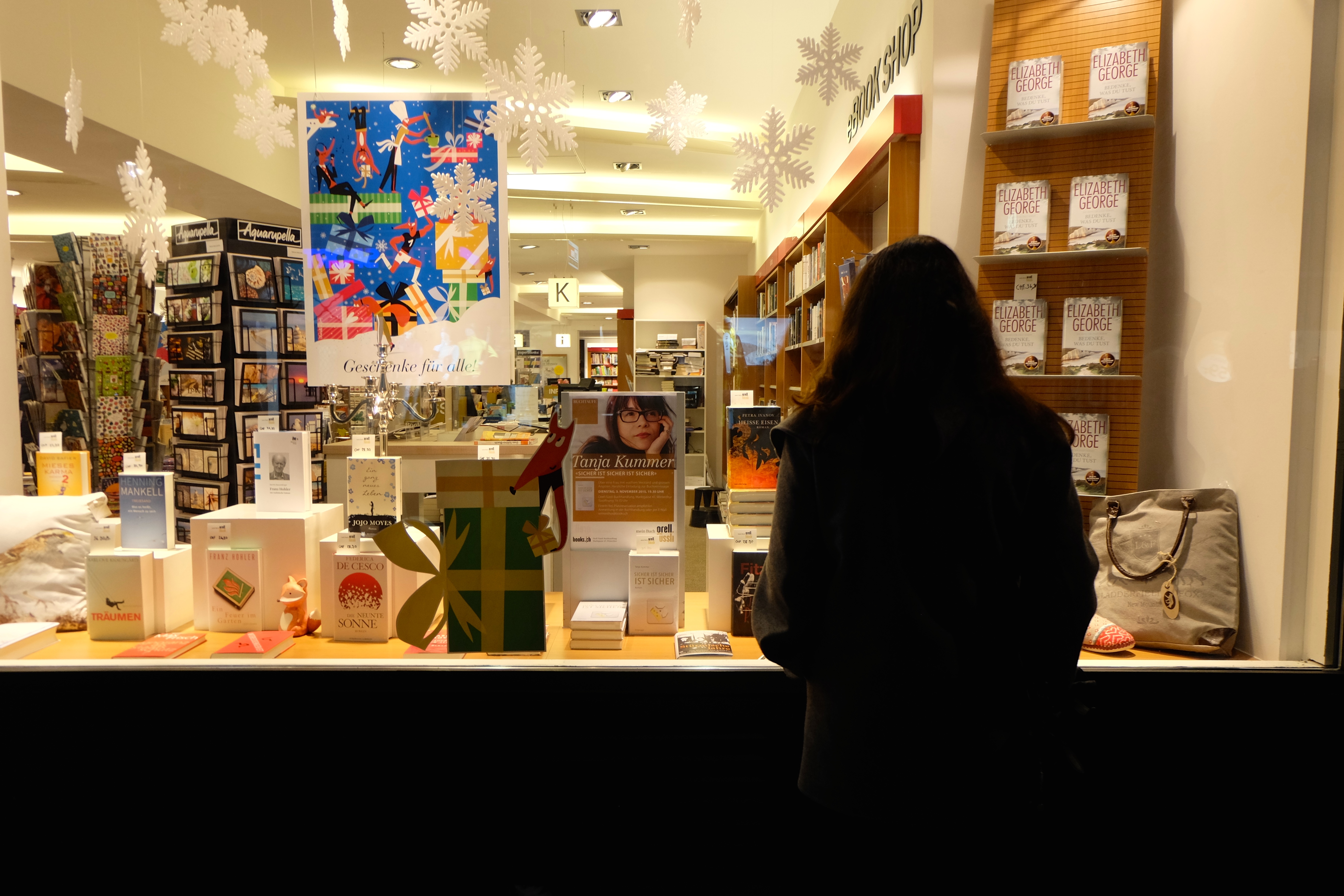 Sicher ist sicher...lieber nicht zu spät kommen zur lang herbeigesehnten Vernissage. Schon vor Beginn der Veranstaltung spickten die BesucherInnen am Abend interessiert durchs Schaufenster der Buchhandlung Orell Füssli in Winterthur, erster Ort der Lesetour. (Bilder: Patrizia Barbera)