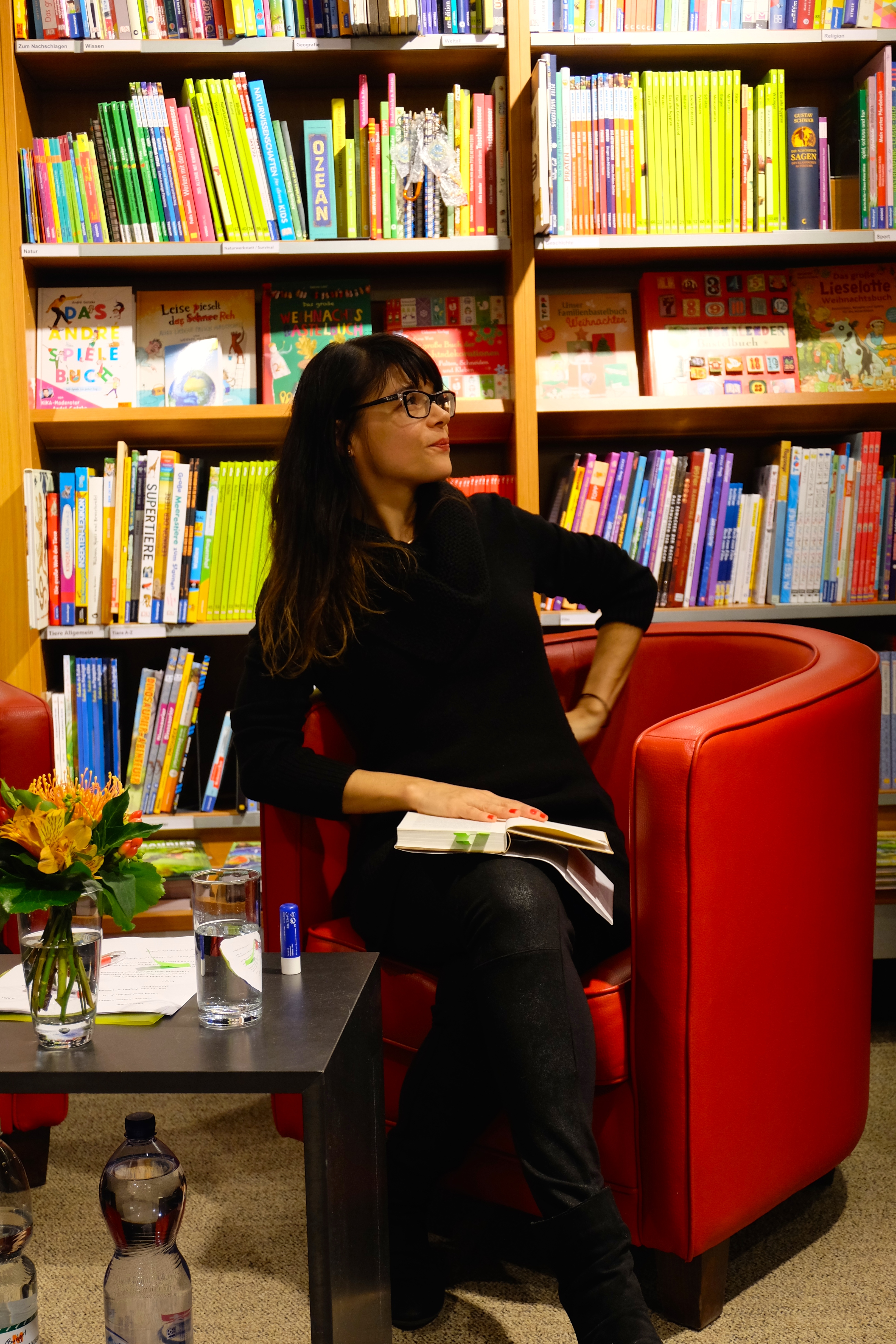 ...und dann geht es endlich los. Tanja liest den Anfang des Buches vor und erklärt im Nachhinein die Charakterzüge der Hauptperson Martina, die Buchhändlerin ist und zusätzlich zum nahenden, stressigen Weihnachtsgeschäft "sowieso schon immer im roten Bereich lebt". Das Buch begleitet Martina bei den aufregenden Tagen bis Weihnachten und führt einfühlsam, teils nervenaufreibend und immer amüsant-liebevoll durch die Gedanken und Handlungen der Haupt- und Nebenfiguren und behandelt ganz "nebenbei" das Thema Angststörungen und Zwänge.