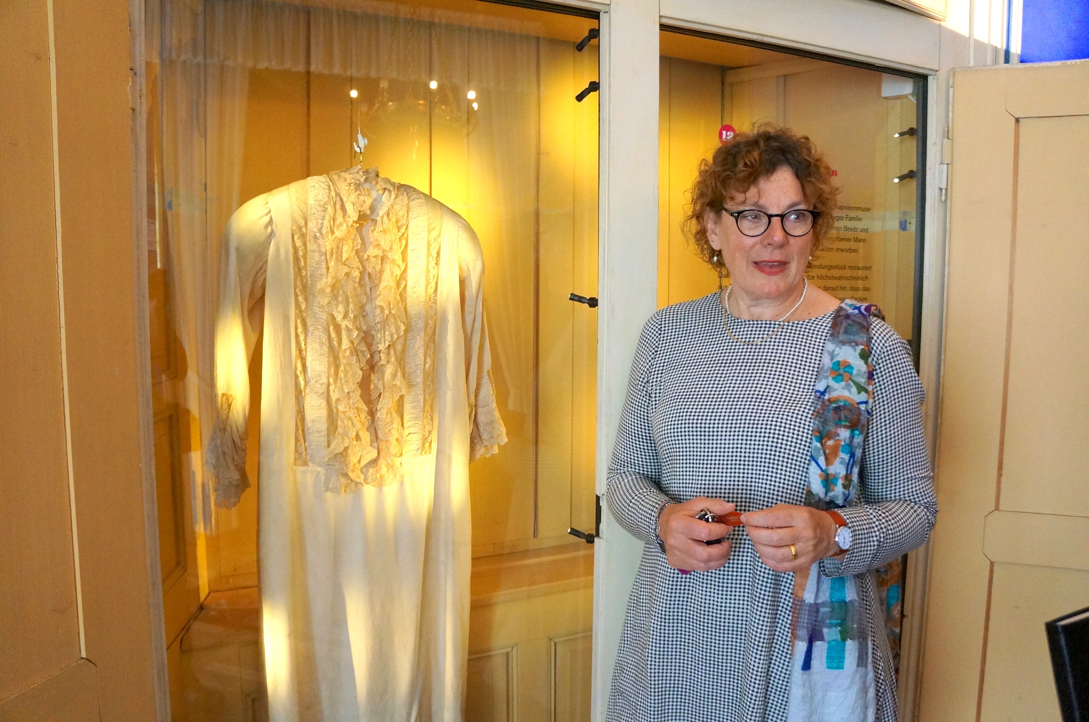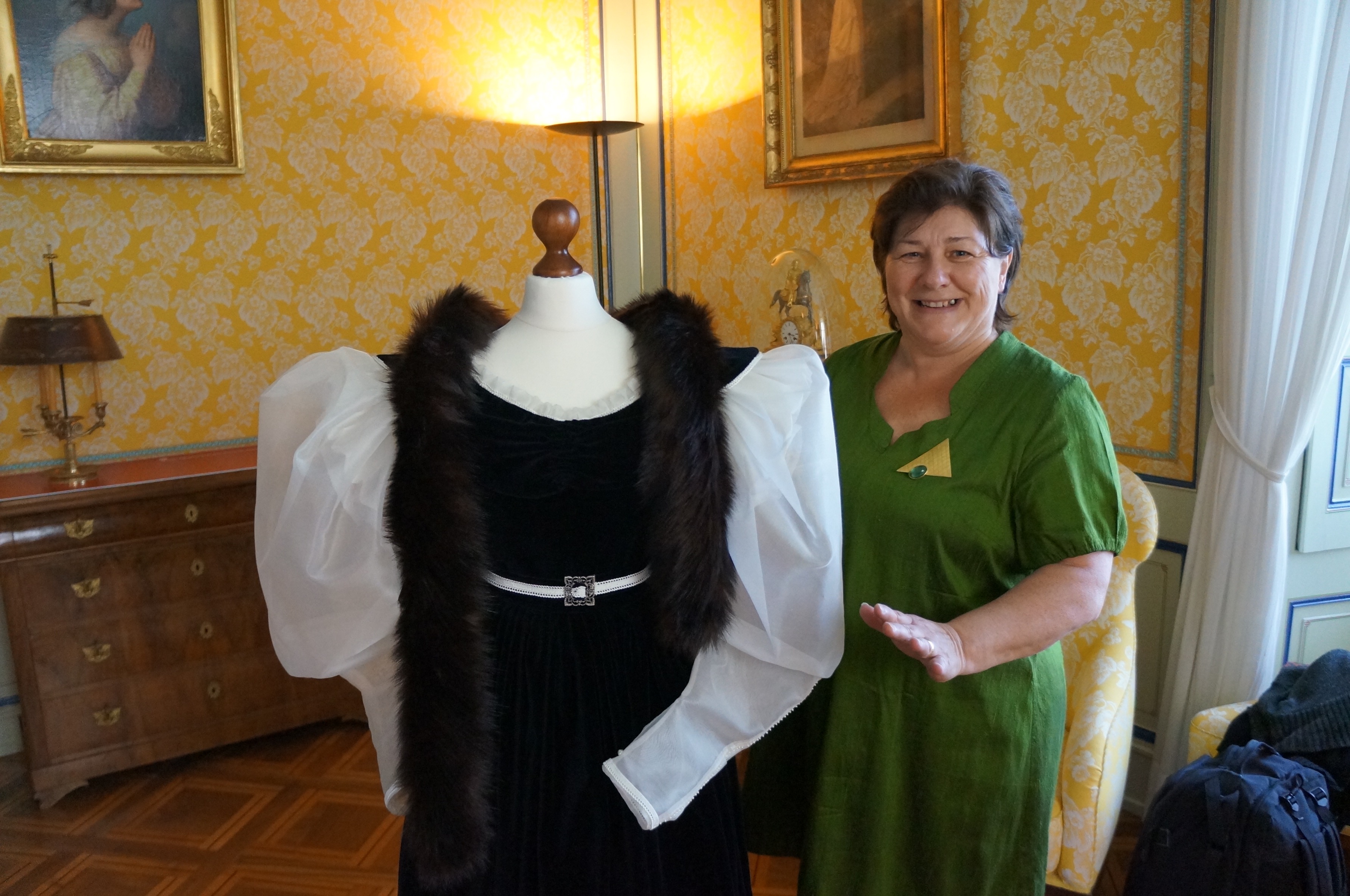 Sinnliches Erleben ermöglicht auch der Fleiss und die Leidenschaft von Susanne Drascher. Sie hat zwei Kleider aus der Zeit nachgeschneidert. „Die Schnittmuster kann man tatsächlich kaufen, aber den ganzen Unterbau musste ich selbst entwickelt", erzählt sie. Im Schlafzimmer der Königin findet sich nun ein nachtblaues Kleid in Grösse 34, das bis ins Detail einem Gewand gleicht, das die Königin für ein Portrait getragen hat. Das Schönheitsideal habe sich von der Empire-Zeit zur Romantik geändert, erklärt die Expertin. Anfang des 19. Jahrhunderts sollten die Frauen wie ätherische Wesen über den Boden schweben. „Die Hammelkeulenärmel wirken heute ein bisschen wie daunengefüllte Schwimmflügel."