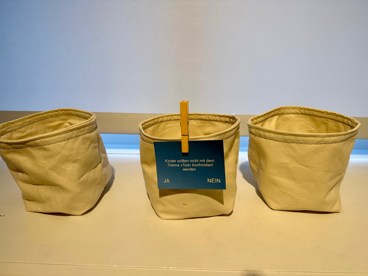 Die Rosenegg hat nach guten Erfahrungen in der Ausstellung «Geplatzte Stadt(t)räume» Fragen formuliert, über die das Publikum abstimmen kann. «Ist die Jenseitsvorstellung für Sie wichtig?», « Darf man selbst über sein Lebensende bestimmen?» Oder «Wie wollen Sie bestattet werden?» Die Ergebnisse könnten bei den Podiumsdiskussionen im Rahmenprogramm als Anregung dienen.