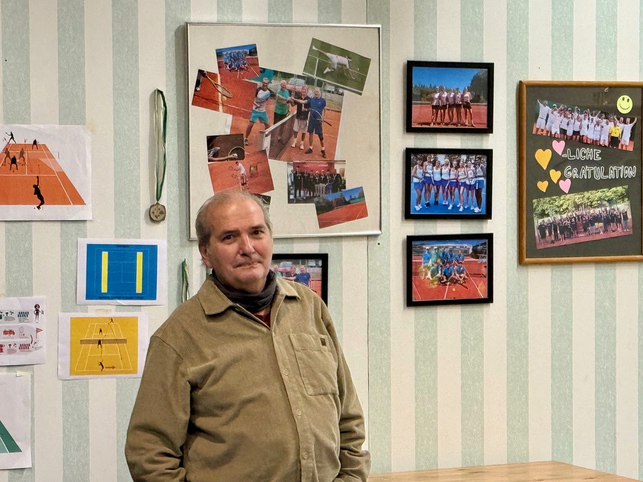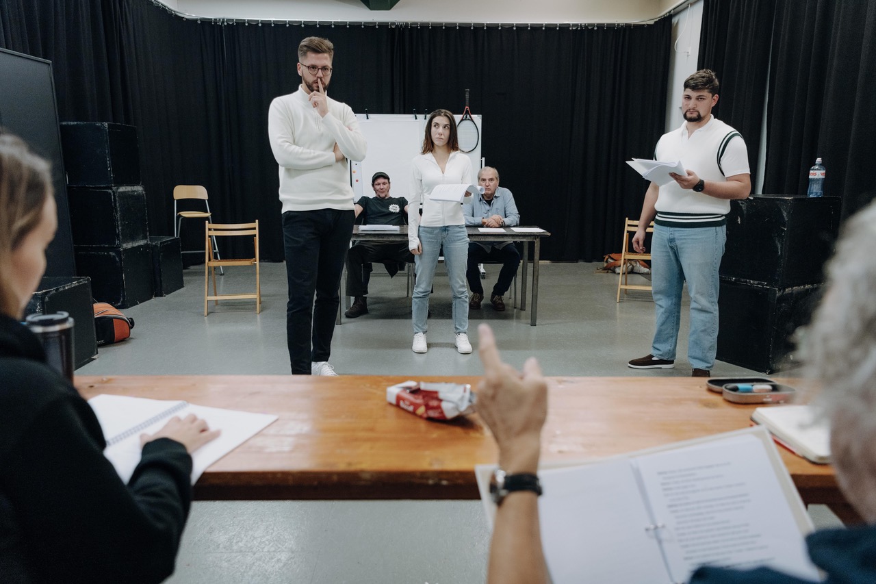 Das Bühnenbild im Theaterhaus Thurgau ist bereits sichtbar – einmal mehr stammt es von Peter Affentranger. Wir befinden uns eindeutig im Vereinslokal eines Tennisclubs. Fotos vergangener Turniere hängen an den Wänden, Pokale stehen in der obligatorischen Vitrine. Doch noch ist bei den Proben vieles im Fluss. «Ich komme aus dieser Tür raus, oder?», fragt Thomas Götz, der den Präsidenten des Sportvereins spielt.