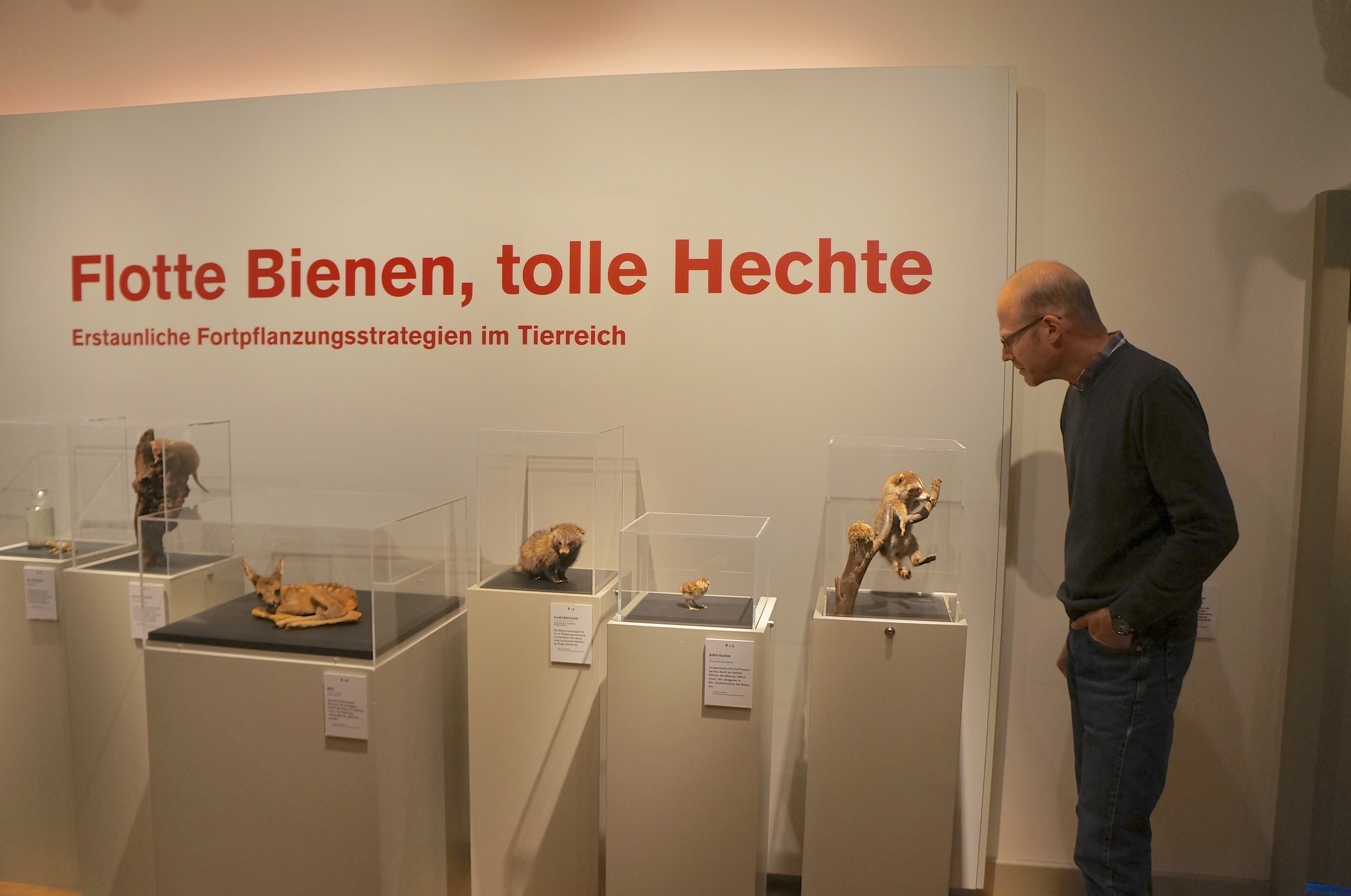 Zwei in einander verkeilte Hirsche stehen im Wortsinn im Mittelpunkt der Sonderausstellung. Sie illustrieren, wie gefährlich die Fortpflanzung für Tiere sein kann, denn ihr Kampf um die Hirschkühe des Harems endete tödlich. Sie verfingen sich erst ineinander und dann in einem Zaun, konnten sich nicht mehr lösen und mussten erschossen werden.